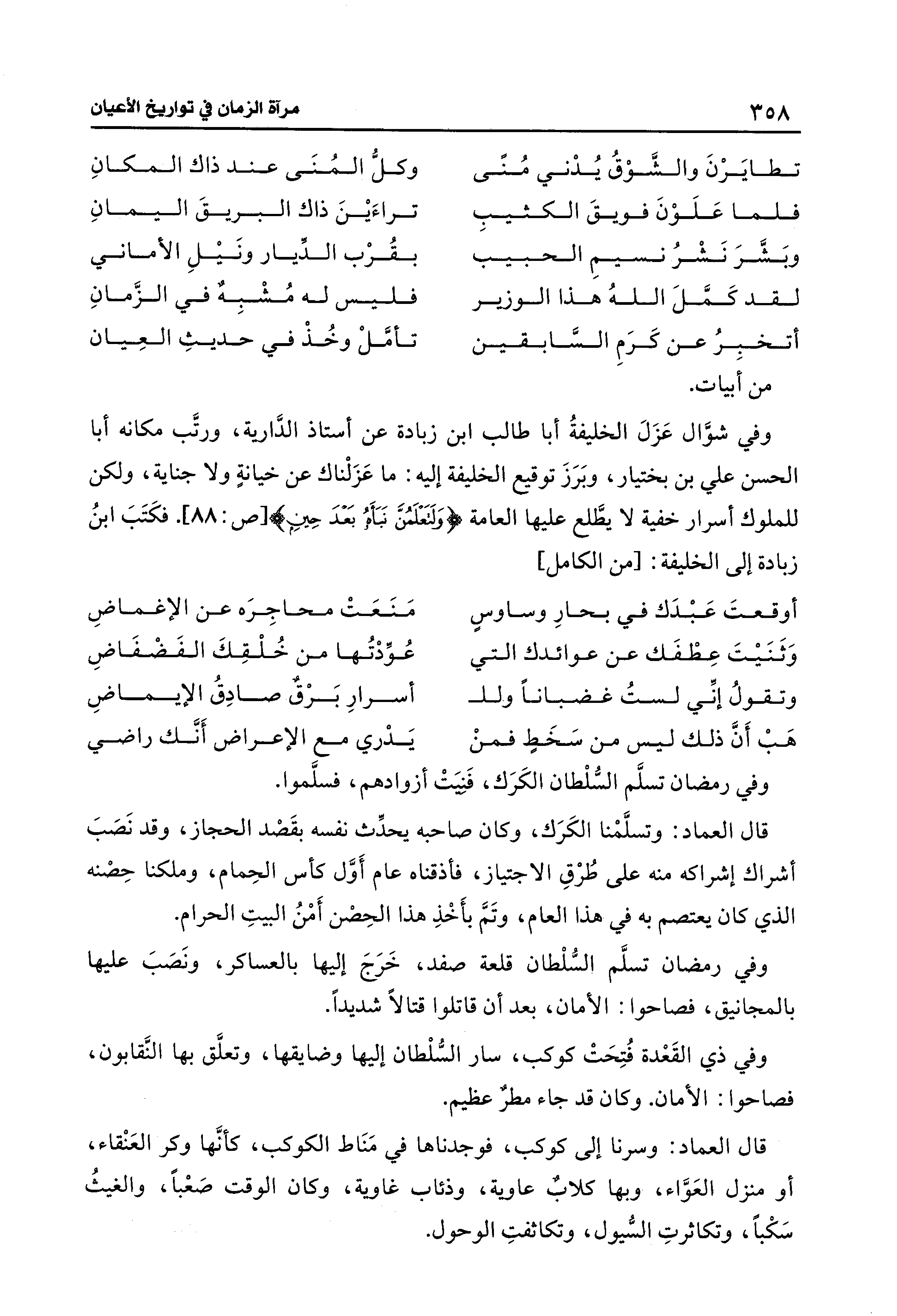 وفي شوّال عَزَلَ الخليفةُ أبا طالب ابن زيادة عن أستاذ الدّارية، ورتَّب مكانه أبا الحسن علي بن بختيار، وبَرَزَ توقيع الخليفة إليه: ما عَزَلْناك عن خيايةٍ ولا جناية، ولكن للملوك أسرار خفية لا يطَّلع عليها العامة {وَلَتَعْلَمُنَّ نَبَأَهُ بَعْدَ حِينٍ} [ص: 88]. فكَتَبَ ابنُ زيادة إلى الخليفة: [من الكامل]