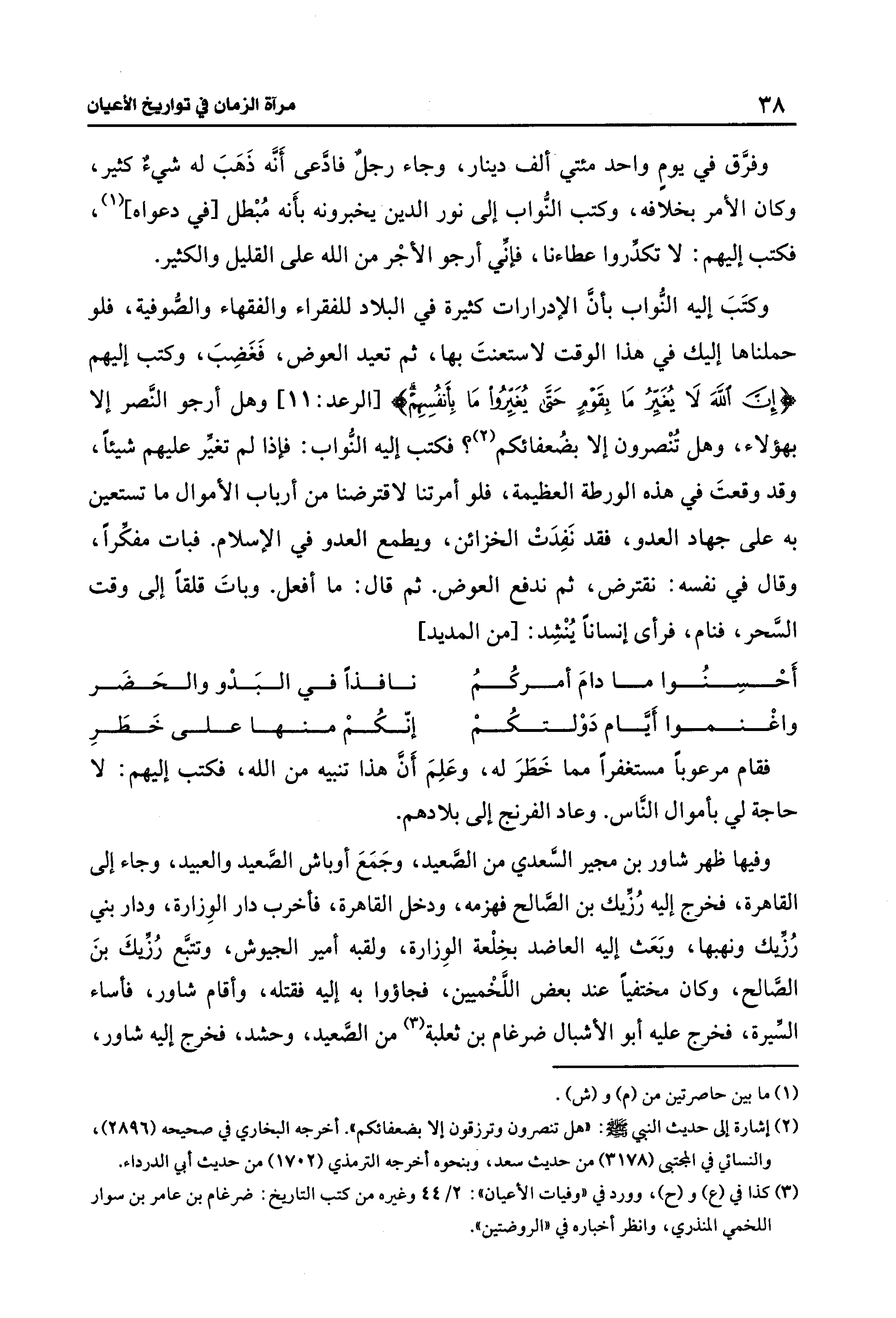 وكتَبَ إليه النُّواب بأنَّ الإدرارات كثيرة في البلاد للفقراء والفقهاء والصُّوفية، فلو حملناها إليك في هذا الوقت لاستعنتَ بها، ثم تعيد العوض، فَغَضِبَ، وكتب إليهم {إِنَّ اللَّهَ لَا يُغَيِّرُ مَا بِقَوْمٍ حَتَّى يُغَيِّرُوا مَا بِأَنْفُسِهِمْ} [الرعد: 11] وهل أرجو النَّصر إلا بهؤلاء، وهل تُنْصرون إلا بضُعفائكم (¬2)؟ فكتب إليه النُّواب: فإذا لم تغيِّر عليهم شيئًا، وقد وقعتَ في هذه الورطة العظيمة، فلو أمرتنا لاقترضنا من أرباب الأموال ما تستعين به على جهاد العدو، فقد نَفِدَتْ الخزائن، ويطمع العدو في الإسلام. فبات مفكِّرًا، وقال في نفسه: نقترض، ثم ندفع العوض. ثم قال: ما أفعل. وباتَ قلقًا إلى وقت السَّحر، فنام، فرأى إنسانًا يُنْشِد: [من المديد]