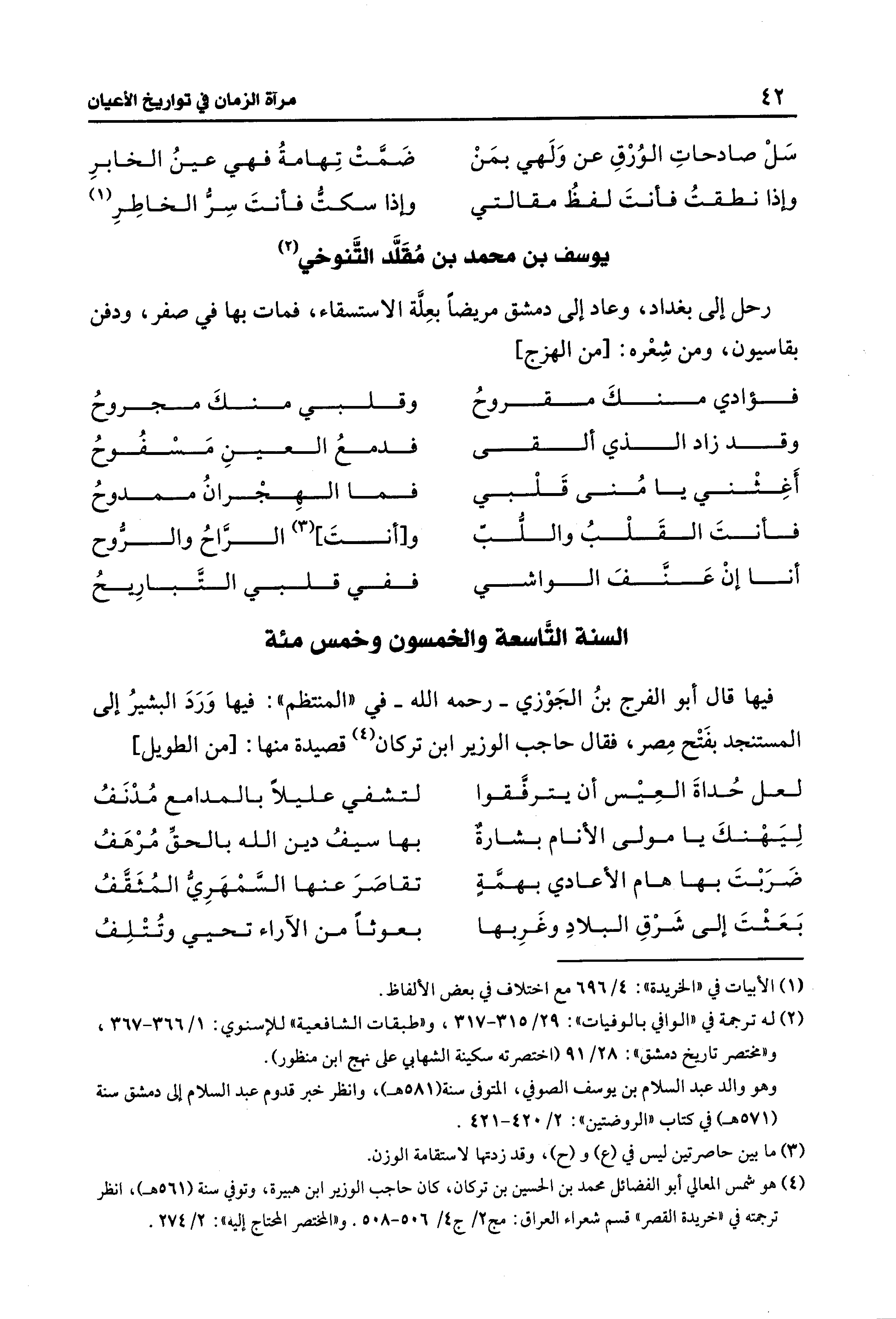 (¬4) هو شمس المعالي أبو الفضائل محمد بن الحسين بن تركان، كان حاجب الوزير ابن هبيرة، وتوفي سنة (561 هـ)، انظر ترجمته في "خريدة القصر" قسم شعراء العراق: مج 2 / ج 4/ 506 - 508. و"المختصر المحتاج إليه": 2/ 274.