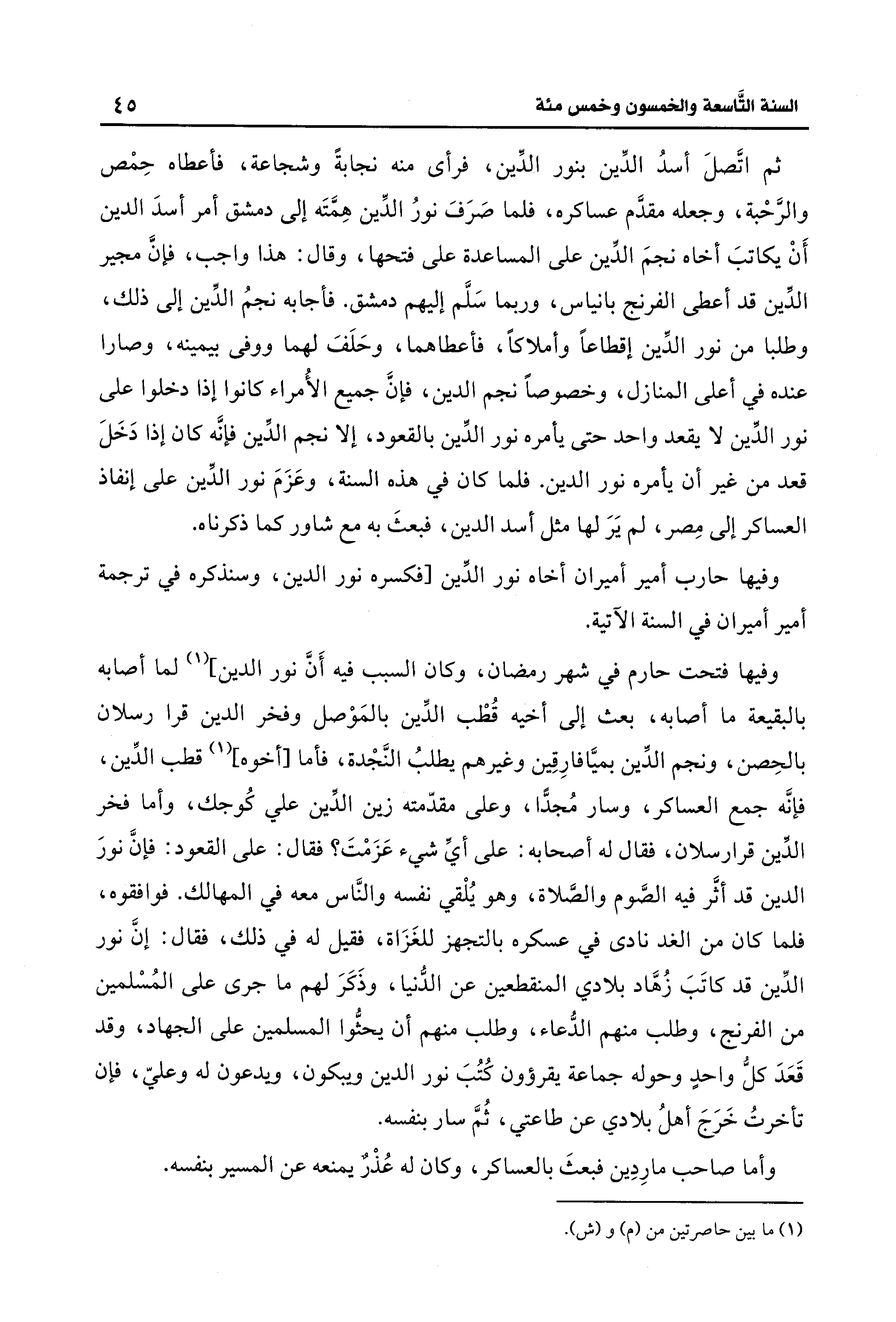 ثم اتَّصلَ أسدُ الدِّين بنور الدِّين، فرأى منه نجابة وشجاعة، فأعطاه حِمْص والرَّحْبة، وجعله مقدَّم عساكره، فلما صَرَفَ نورُ الدِّين هِمَّتَه إلى دمشق أمر أسدَ الدين أَنْ يكاتبَ أخاه نجمَ الدِّين على المساعدة على فتحها، وقال: هذا واجب، فإنَّ مجير الدِّين قد أعطى الفرنج بانياس، وربما سَلَّم إليهم دمشق. فأجابه نجمُ الدِّين إلى ذلك، وطلبا من نور الدِّين إقطاعًا وأملاكًا، فأعطاهما، وحَلَفَ لهما ووفى بيمينه، وصارا عنده في أعلى المنازل، وخصوصًا نجم الدين، فإنَّ جميع الأُمراء كانوا إذا دخلوا على نور الدِّين لا يقعد واحد حتى يأمره نور الدِّين بالقعود، إلَّا نجم الدِّين فإنَّه كان إذا دَخَلَ قعد من غير أن يأمره نور الدين. فلما كان في هذه السنة، وعَزَمَ نور الدِّين على إنفاذ العساكر إلى مِصر، لم يَرَ لها مثل أسد الدين، فبعثَ به مع شاور كما ذكرناه.