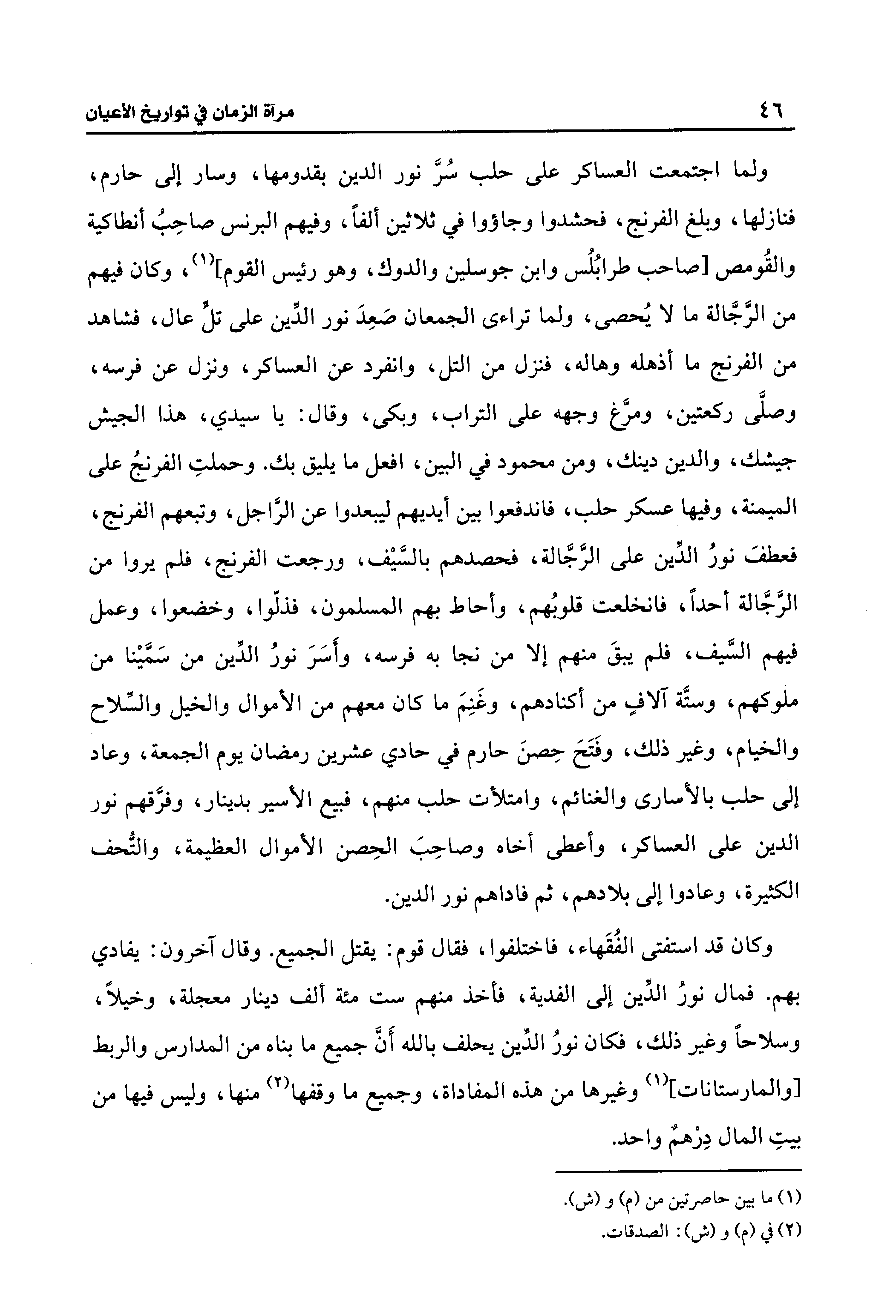 وكان قد استفتى الفُقَهاء، فاختلفوا، فقال قوم: يقتل الجميع. وقال آخرون: يفادي بهم. فمال نورُ الدِّين إلى الفدية، فأخذ منهم ست مئة ألف دينار معجلة، وخيلًا، وسلاحًا وغير ذلك، فكان نورُ الدِّين يحلف بالله أَنَّ جميع ما بناه من المدارس والربط [والمارستانات] (¬1) وغيرها من هذه المفاداة، وجميع ما وقفها (¬2) منها، وليس فيها من بيتِ المال دِرْهمٌ واحد.