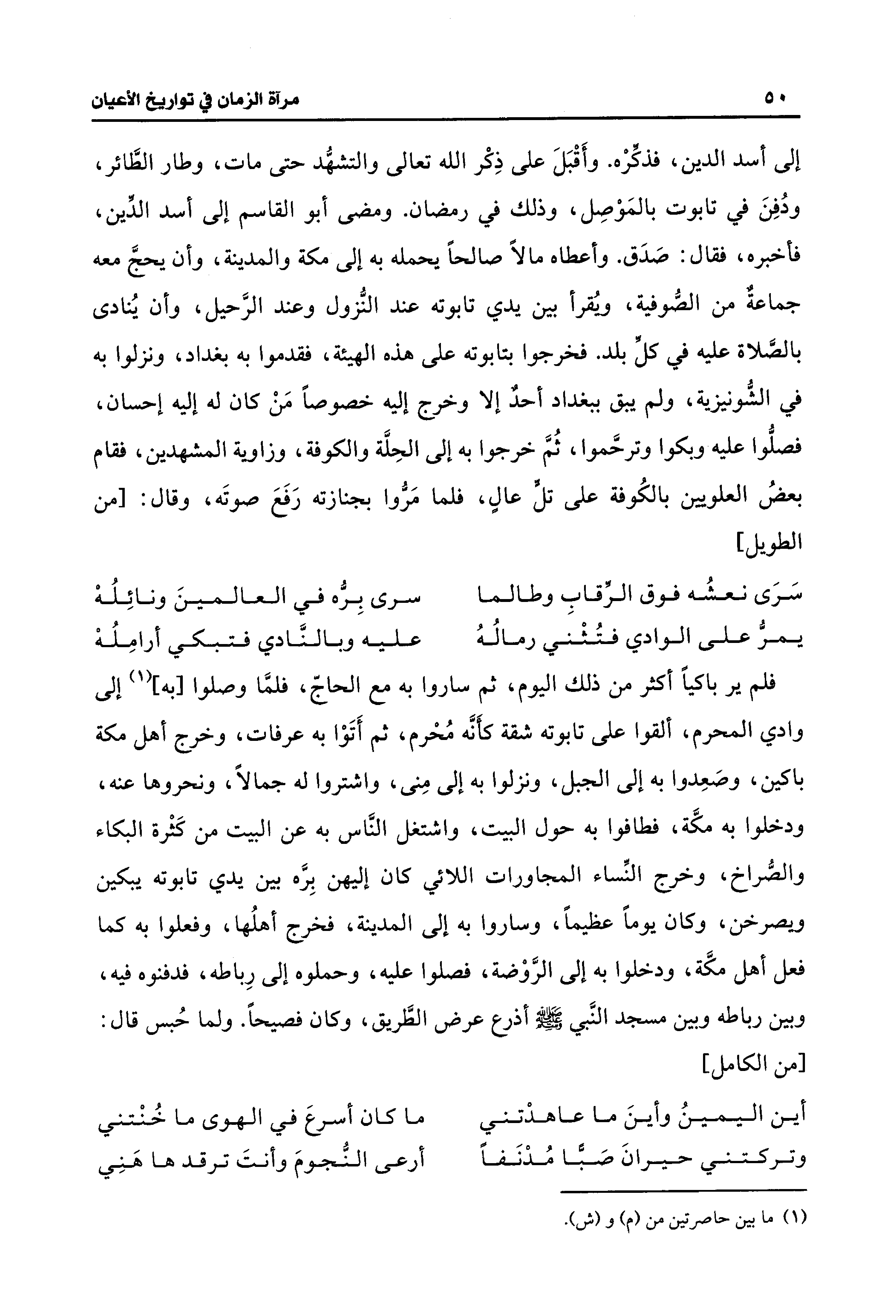 إلى أسد الدين، فذكِّرْه. وأَقْبَلَ على ذِكْر الله تعالى والتشهُّد حتى مات، وطار الطَّائر، ودُفِنَ في تابوت بالمَوْصِل، وذلك في رمضان. ومضى أبو القاسم إلى أسد الدِّين، فأخبره، فقال: صَدَق. وأعطاه مالًا صالحًا يحمله به إلى مكة والمدينة، وأن يحجَّ معه جماعةٌ من الصُّوفية، ويُقرأ بين يدي تابوته عند النُّزول وعند الرَّحيل، وأن يُنادى بالصَّلاة عليه في كلِّ بلد. فخرجوا بتابوته على هذه الهيئة، فقدموا به بغداد، ونزلوا به في الشُّونيزية، ولم يبق ببغداد أحدٌ إلَّا وخرج إليه خصوصًا مَنْ كان له إليه إحسان، فصلُّوا عليه وبكوا وترحَّموا، ثُمَّ خرجوا به إلى الحِلَّة والكوفة، وزاوية المشهدين، فقام بعضُ العلويين بالكُوفة على تلٍّ عالٍ، فلما مَرُّوا بجنازته رَفَعَ صوتَه، وقال: [من الطويل]