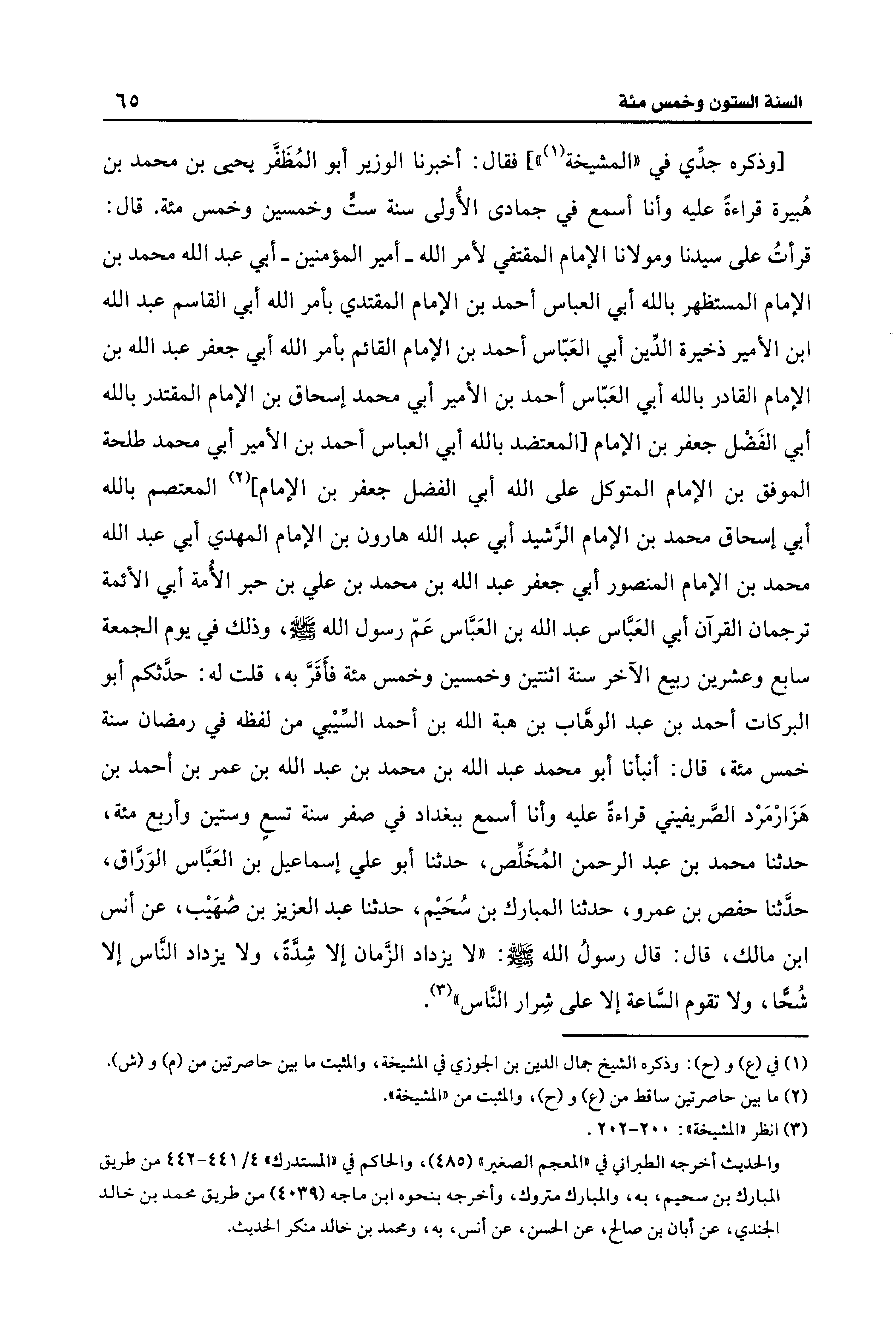 [وذكره جدِّي في "المشيخة (¬1) "] فقال: أخبرنا الوزير أبو المُظَفَّر يحيى بن محمد بن هُبيرة قراءةً عليه وأنا أسمع في جمادى الأُولى سنة ستٍّ وخمسين وخمس مئة. قال: قرأتُ على سيدنا ومولانا الإمام المقتفي لأمر الله - أمير المؤمنين - أبي عبد الله محمد بن الإمام المستظهر بالله أبي العباس أحمد بن الإمام المقتدي بأمر الله أبي القاسم عبد الله ابن الأمير ذخيرة الدِّين أبي العَبّاس أحمد بن الإمام القائم بأمر الله أبي جعفر عبد الله بن الإمام القادر بالله أبي العَبّاس أحمد بن الأمير أبي محمد إسحاق بن الإمام المقتدر بالله أبي الفَضْل جعفر بن الإمام [المعتضد بالله أبي العباس أحمد بن الأمير أبي محمد طلحة الموفق بن الإمام المتوكل على الله أبي الفضل جعفر بن الإمام] (¬2) المعتصم بالله أبي إسحاق محمد بن الإمام الرَّشيد أبي عبد الله هارون بن الإمام المهدي أبي عبد الله محمد بن الإمام المنصور أبي جعفر عبد الله بن محمد بن علي بن حبر الأُمة أبي الأئمة ترجمان القرآن أبي العَبَّاس عبد الله بن العَبَّاس عَمّ رسول الله - صلى الله عليه وسلم -، وذلك في يوم الجمعة سابع وعشرين ربيع الآخر سنة اثنتين وخمسين وخمس مئة فأَقَرَّ به، قلت له: حدَّثكم أبو البركات أحمد بن عبد الوهَّاب بن هبة الله بن أحمد السِّيبي من لفظه في رمضان سنة خمس مئة، قال: أنبأنا أبو محمد عبد الله بن محمد بن عبد الله بن عمر بن أحمد بن هَزَارْمَرْد الصَّريفيني قراءةً عليه وأنا أسمع ببغداد في صفر سنة تسعٍ وستين وأربع مئة، حدثنا محمد بن عبد الرحمن المُخَلِّص، حدثنا أبو علي إسماعيل بن العَبَّاس الوَرَّاق، حدَّثنا حفص بن عمرو، حدثنا المبارك بن سُحَيم، حدثنا عبد العزيز بن صُهَيب، عن أنس بن مالك، قال: قال رسولُ الله - صلى الله عليه وسلم -: "لا يزداد الزَّمان إلَّا شِدَّةً، ولا يزداد النَّاس إلَّا شُحًّا، ولا تقوم السَّاعة إلَّا على شِرار النَّاس" (¬3).