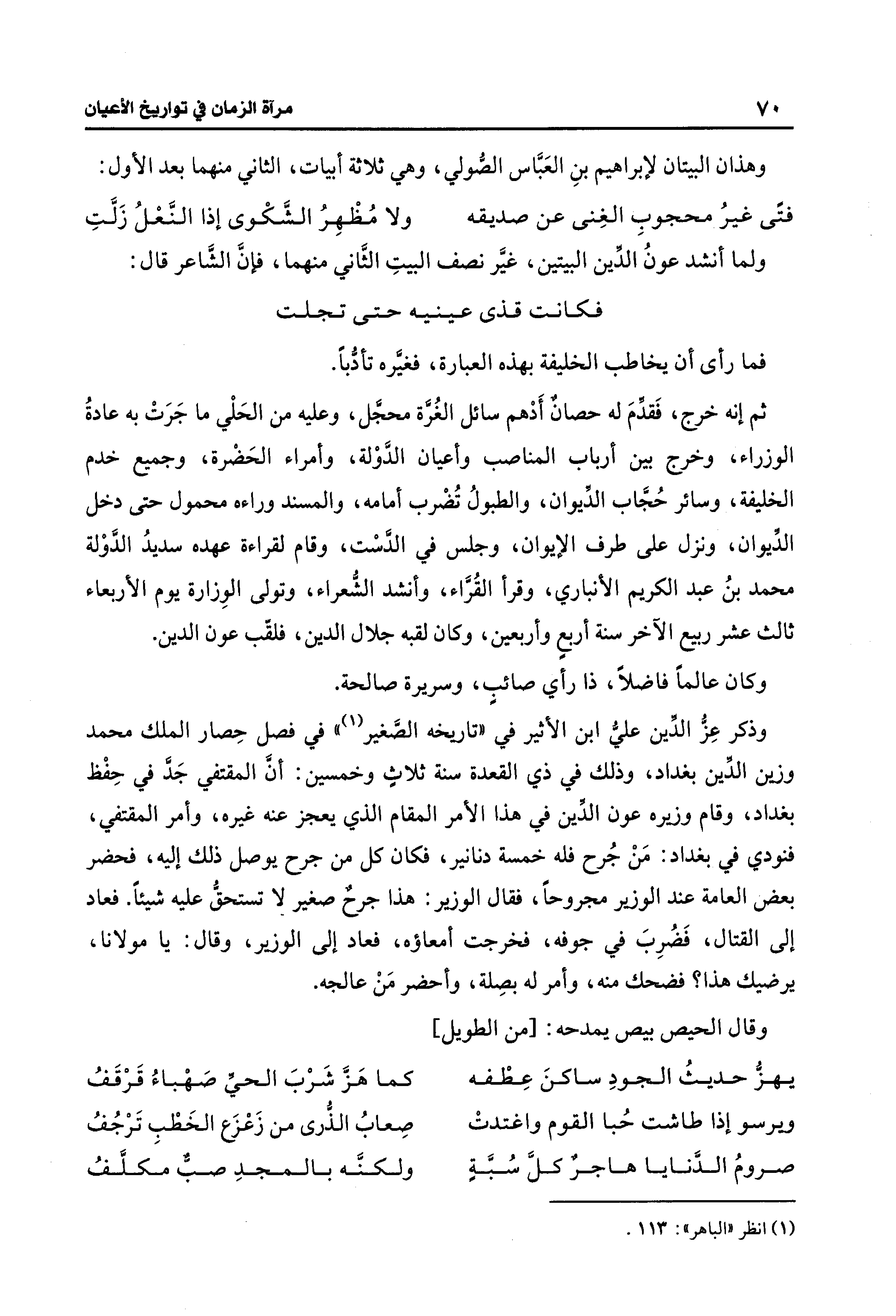 وذكر عِزُّ الدِّين عليُّ بن الأثير في "تاريخه الصَّغير (¬1) " في فصل حِصار الملك محمد وزين الدِّين بغداد، وذلك في ذي القعدة سنة ثلاثٍ وخمسين: أنَّ المقتفي جَدَّ في حِفْظ بغداد، وقام وزيره عون الدِّين في هذا الأمر المقام الذي يعجز عنه غيره، وأمر المقتفي، فنودي في بغداد: مَنْ جُرح فله خمسة دنانير، فكان كل من جرح يوصل ذلك إليه، فحضر بعض العامة عند الوزير مجروحًا، فقال الوزير: هذا جرحٌ صغير لا تستحقُّ عليه شيئًا. فعاد إلى القتال، فَضُرِبَ في جوفه، فخرجت أمعاؤه، فعاد إلى الوزير، وقال: يا مولانا، يرضيك هذا؟ فضحك منه، وأمر له بصِلة، وأحضر مَنْ عالجه.