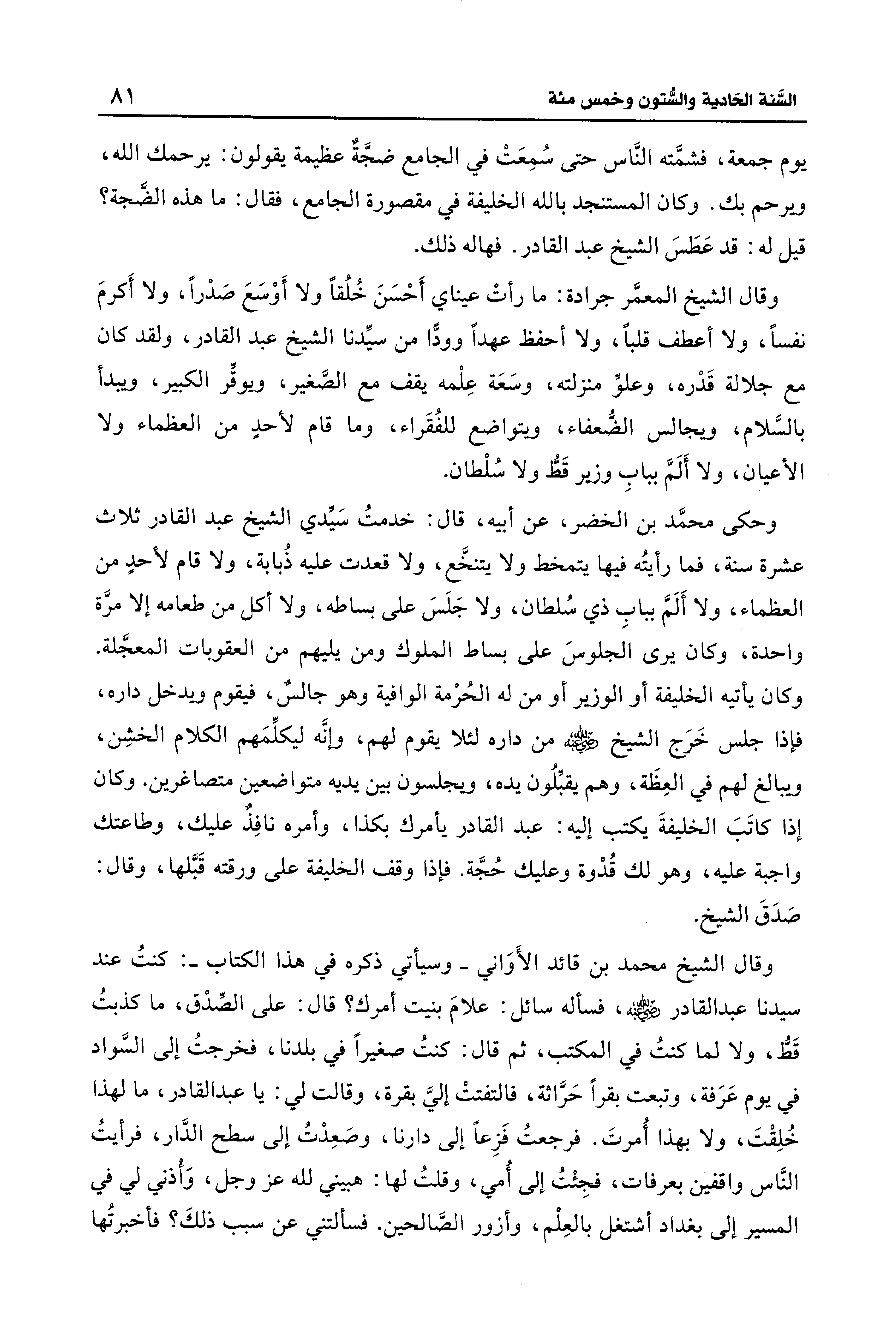 وحكى محمَّد بن الخضر، عن أبيه، قال: خدمتُ سَيِّدي الشيخ عبد القادر ثلاث عشرة سنة، فما رأيتُه فيها يتمخط ولا يتنخَّع، ولا قعدت عليه ذُبابة، ولا قام لأحدٍ من العظماء، ولا أَلَمَّ ببابِ ذي سُلطان، ولا جَلَسَ على بساطه، ولا أكل من طعامه إلَّا مرَّة واحدة، وكان يرى الجلوسَ على بساط الملوك ومن يليهم من العقوبات المعجَّلة. وكان يأتيه الخليفة أو الوزير أو من له الحُرْمة الوافية وهو جالسٌ، فيقوم ويدخل داره، فإذا جلس خَرَج الشيخ - رضي الله عنه - من داره لئلا يقوم لهم، وإنَّه ليكلِّمَهم الكلام الخشِن، ويبالغ لهم في العِظَة، وهم يقبِّلُون يده، ويجلسون بين يديه متواضعين متصاغرين. وكان إذا كاتَبَ الخليفةَ يكتب إليه: عبد القادر يأمرك بكذا، وأمره نافِذٌ عليك، وطاعتك واجبة عليه، وهو لك قُدْوة وعليك حُجَّة. فإذا وقف الخليفة على ورقته قَبَّلها، وقال: صَدَقَ الشيخ.
