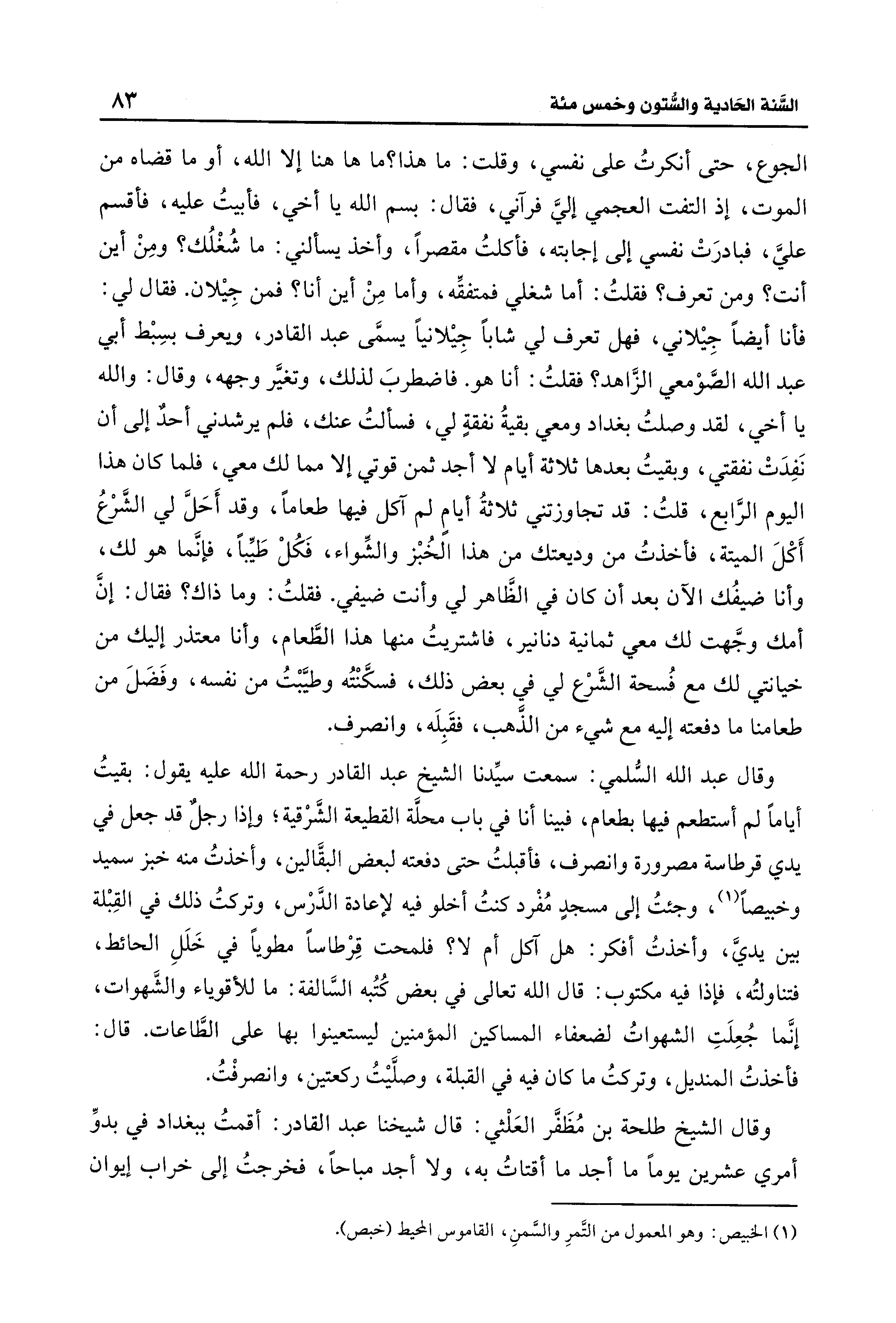 الجوع، حتى أنكرتُ على نفسي، وقلت: ما هذا؟ ما ها هنا إلَّا الله، أو ما قضاه من الموت، إذ التفت العجمي إليَّ فرآني، فقال: بسم الله يا أخي، فأبيتُ عليه، فأقسم عليَّ، فبادرَتْ نفسي إلى إجابته، فأكلتُ مقصرًا، وأخذ يسألني: ما شُغْلُك؟ ومِنْ أين أنت؟ ومن تعرف؟ فقلتُ: أما شغلي فمتفقِّه، وأما مِنْ أين أنا؟ فمن جِيلان. فقال لي: فأنا أيضًا جِيلاني، فهل تعرف لي شابًّا جِيلانيًّا يسمَّى عبد القادر، ويعرف بسِبْط أبي عبد الله الصَّوْمعي الزَّاهد؟ فقلتُ: أنا هو. فاضطربَ لذلك، وتغيَّر وجهه، وقال: والله يا أخي، لقد وصلتُ بغداد ومعي بقيةُ نفقةٍ لي، فسألتُ عنك، فلم يرشدني أحدٌ إلى أن نَفِدَتْ نفقتي، وبقيتُ بعدها ثلاثة أيام لا أجد ثمن قوتي إلَّا مما لك معي، فلما كان هذا اليوم الرَّابع، قلتُ: قد تجاوزتني ثلاثةُ أيامٍ لم آكل فيها طعامًا، وقد أَحَلَّ لي الشَّرْعُ أَكْلَ الميتة، فأخذتُ من وديعتك من هذا الخُبْز والشِّواء، فَكُلْ طَيّبًا، فإنَّما هو لك، وأنا ضيفُك الآن بعد أن كان في الظَّاهر لي وأنت ضيفي. فقلتُ: وما ذاك؟ فقال: إنَّ أمك وجَّهت لك معي ثمانية دنانير، فاشتريتُ منها هذا الطَّعام، وأنا معتذر إليك من خيانتي لك مع فُسحة الشَّرْع لي في بعض ذلك، فسكَّنْتُه وطيَّبْتُ من نفسه، وفَضَلَ من طعامنا ما دفعته إليه مع شيء من الذَّهب، فقَبِلَه، وانصرف.