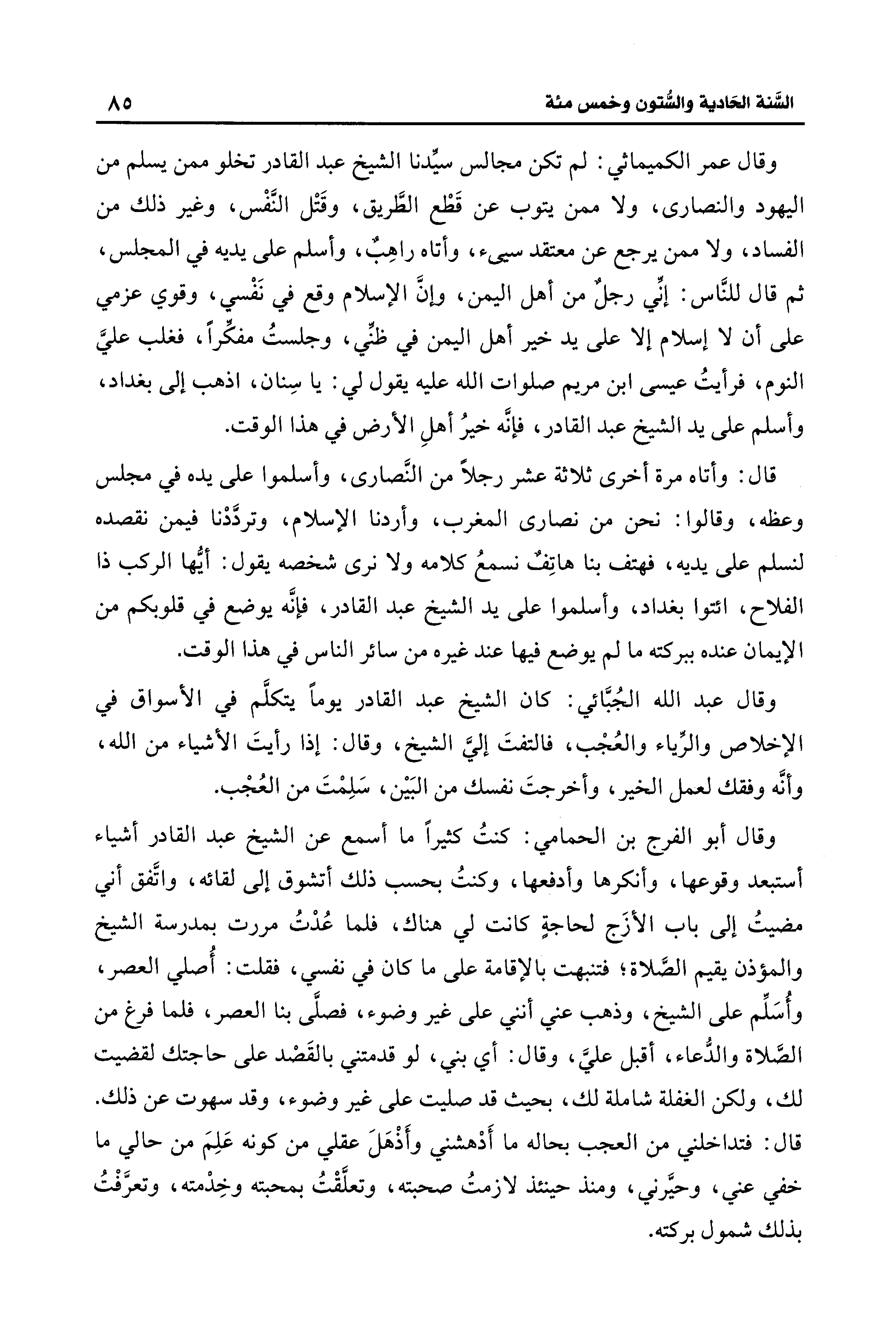 قال: وأتاه مرة أخرى ثلاثة عشر رجلًا من النَّصارى، وأسلموا على يده في مجلس وعظه، وقالوا: نحن من نصارى المغرب، وأردنا الإسلام، وتردَّدْنا فيمن نقصده لنسلم على يديه، فهتف بنا هاتِفٌ نسمعُ كلامه ولا نرى شخصه يقول: أيُّها الركب ذا الفلاح، ائتوا بغداد، وأسلموا على يد الشيخ عبد القادر، فإنَّه يوضع في قلوبكم من الإيمان عنده ببركته ما لم يوضع فيها عند غيره من سائر الناس في هذا الوقت.