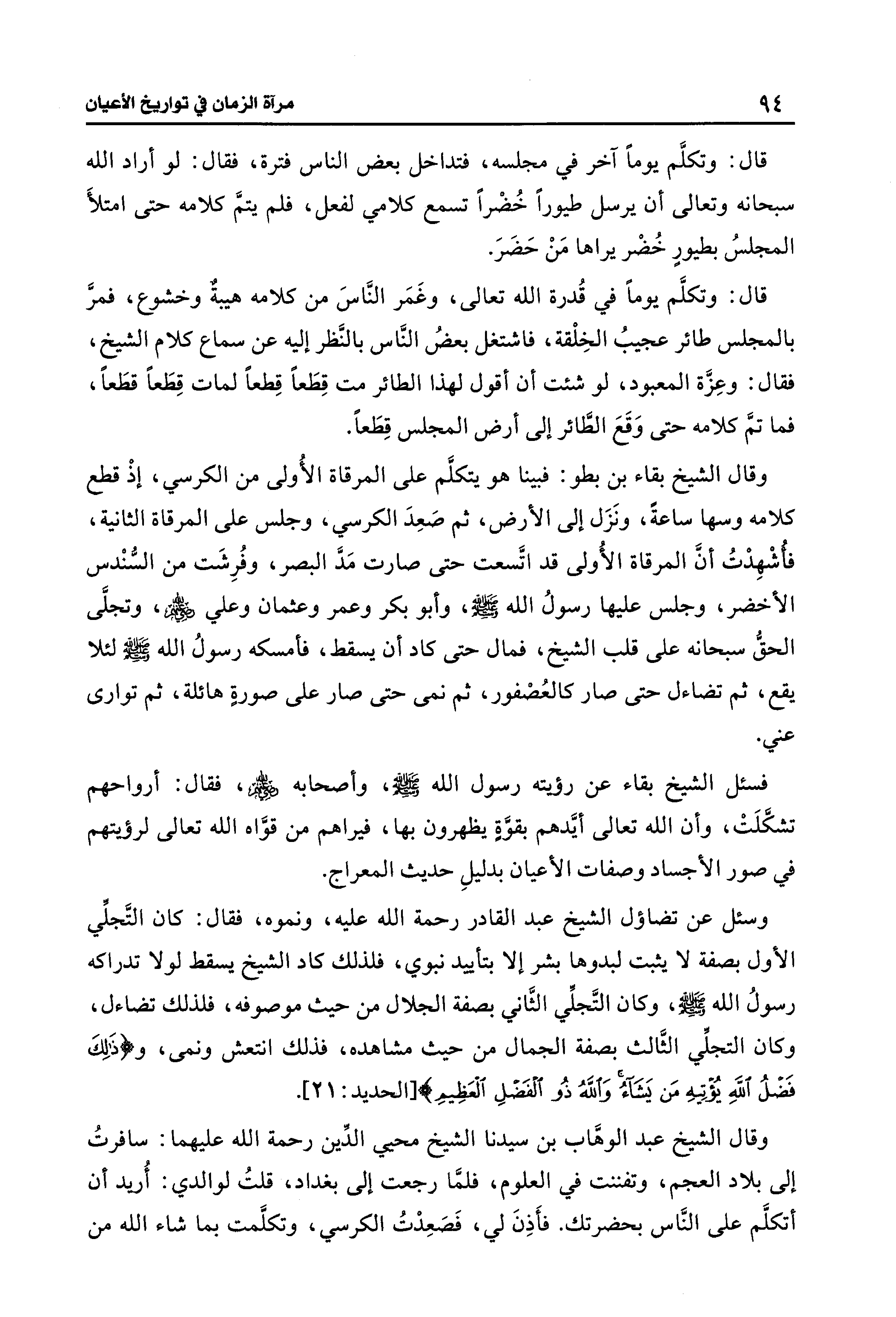 قال: وتكلَّم يومًا في قُدرة الله تعالى، وغَمَر النَّاسَ من كلامه هيبةٌ وخشوع، فمرَّ بالمجلس طائر عجيبُ الخِلْقة، فاشتغل بعضُ النَّاس بالنَّظر إليه عن سماع كلام الشيخ، فقال: وعِزَّة المعبود، لو شئت أن أقول لهذا الطائر من قِطَعًا قِطعًا لمات قِطَعًا قطَعًا، فما تمَّ كلامه حتى وَقَعَ الطَّائر إلى أرض المجلس قِطَعًا.