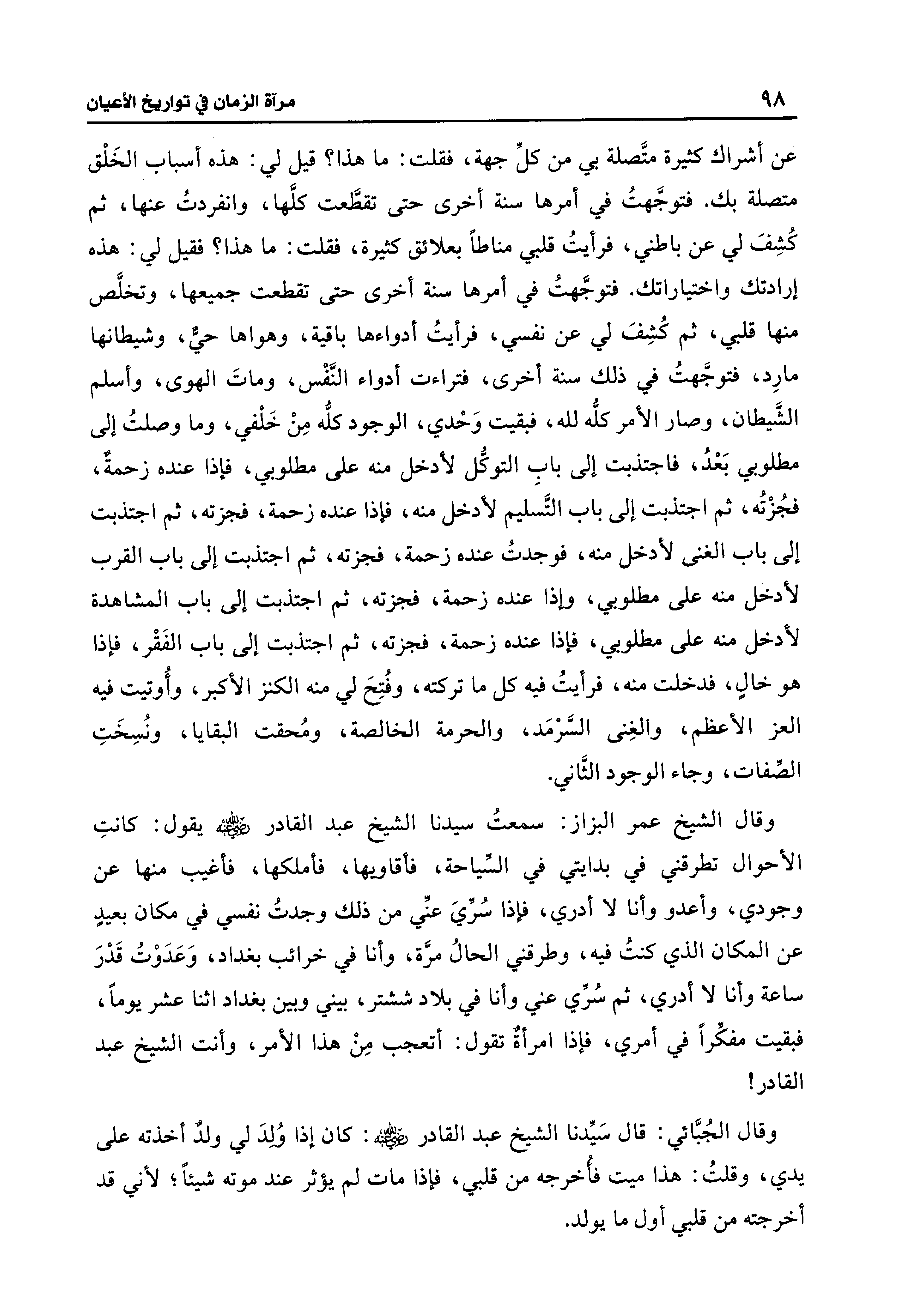عن أشراك كثيرة متَّصلة بي من كلِّ جهة، فقلت: ما هذا؟ قيل لي: هذه أسباب الخَلْق متصلة بك. فتوجَّهتُ في أمرها سنة أخرى حتى تقطَّعت كلَّها، وانفردتُ عنها، ثمَّ كُشِفَ لي عن باطني، فرأيتُ قلبي مناطًا بعلائق كثيرة، فقلت: ما هذا؟ فقيل لي: هذه إرادتك واختياراتك. فتوجَّهتُ في أمرها سنة أخرى حتى تقطعت جميعها، وتخلَّص منها قلبي، ثمَّ كُشِفَ لي عن نفسي، فرأيتُ أدواءها باقية، وهواها حيٌّ، وشيطانها مارِد، فتوجَّهتُ في ذلك سنة أخرى، فتراءت أدواء النَّفْس، وماتَ الهوى، وأسلم الشَّيطان، وصار الأمر كلُّه لله، فبقيت وَحْدي، الوجود كلُّه مِنْ خَلْفي، وما وصلتُ إلى مطلوبي بَعْدُ، فاجتذبت إلى بابِ التوكُّل لأدخل منه على مطلوبي، فإذا عنده زحمةٌ، فجُزْتُه، ثمَّ اجتذبت إلى باب التَّسليم لأدخل منه، فإذا عنده زحمة، فجزته، ثمَّ اجتذبت إلى باب الغنى لأدخل منه، فوجدتُ عنده زحمة، فجزته، ثمَّ اجتذبت إلى باب القرب لأدخل منه على مطلوبي، وإذا عنده زحمة، فجزته، ثمَّ اجتذبت إلى باب المشاهدة لأدخل منه على مطلوبي، فإذا عنده زحمة، فجزته، ثمَّ اجتذبت إلى باب الفَقْر، فإذا هو خالٍ، فدخلت منه، فرأيتُ فيه كل ما تركته، وفُتِحَ لي منه الكنز الأكبر، وأُوتيت فيه العز الأعظم، والغِنى السَّرْمَد، والحرمة الخالصة، ومُحقت البقايا، ونُسِخَتِ الصِّفات، وجاء الوجود الثَّاني.