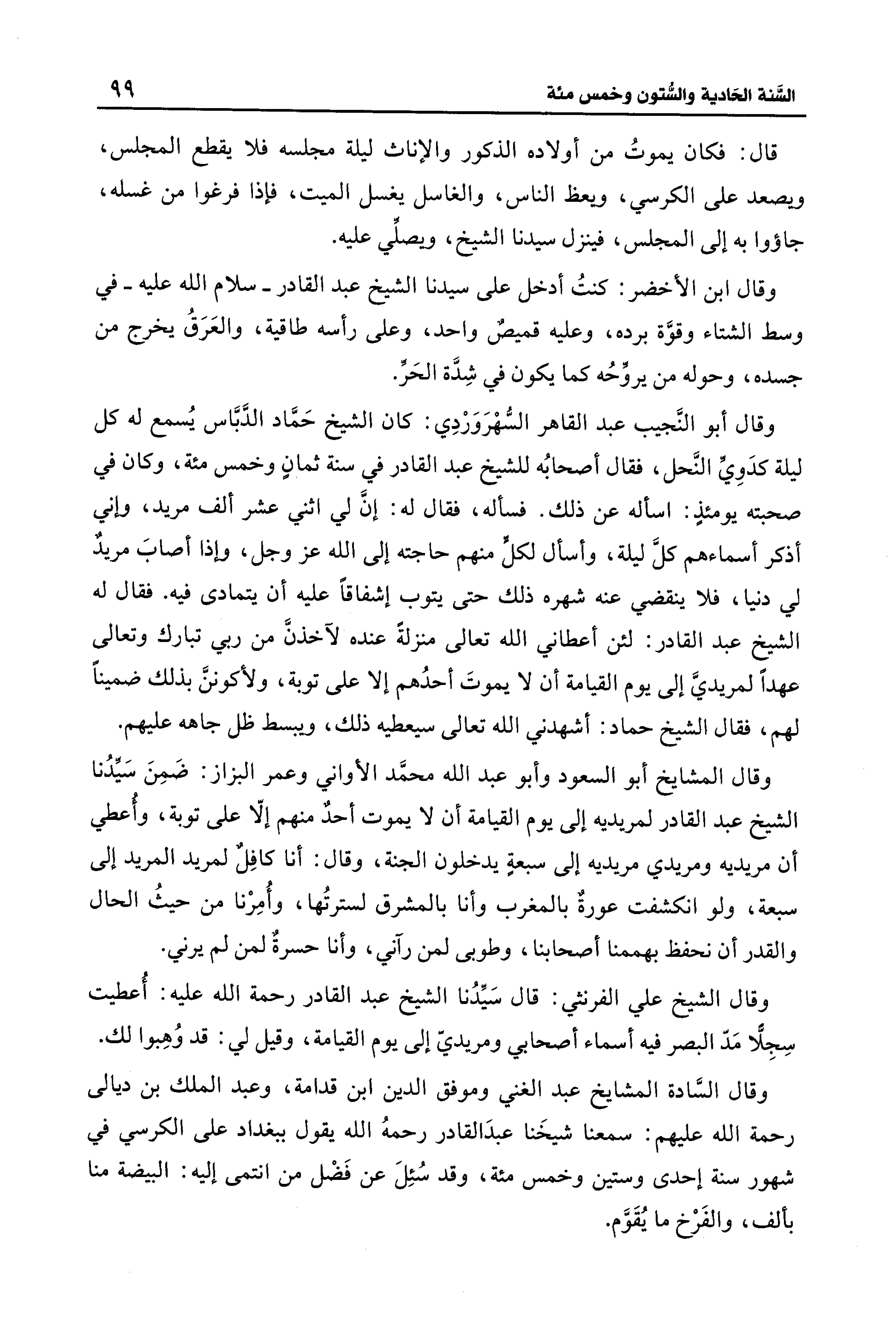 قال: فكان يموتُ من أولاده الذكور والإناث ليلة مجلسه فلا يقطع المجلس، ويصعد على الكرسي، ويعظ الناس، والغاسل يغسل الميت، فإذا فرغوا من غسله، جاؤوا به إلى المجلس، فينزل سيدنا الشيخ، ويصلِّي عليه.
