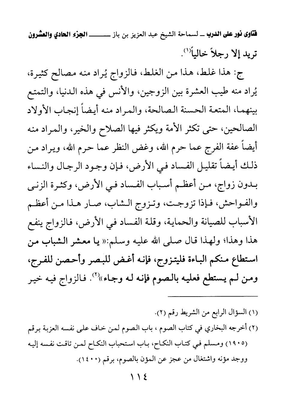 ج: هذا غلط، هذا من الغلط، فالزواج يراد منه مصالح كثيرة، يراد منه طيب العشرة بين الزوجين، والأنس في هذه الدنيا، والتمتع بينهما، المتعة الحسنة الصالحة، والمراد منه أيضا إنجاب الأولاد الصالحين، حتى تكثر الأمة ويكثر فيها الصلاح والخير، والمراد منه أيضا عفة الفرج عما حرم الله، وغض النظر عما حرم الله، ويراد من ذلك أيضا تقليل الفساد في الأرض، فإن وجود الرجال والنساء بدون زواج، من أعظم أسباب الفساد في الأرض، وكثرة الزنى والفواحش، فإذا تزوجت، وتزوج الشاب، صار هذا من أعظم الأسباب للصيانة والحماية، وقلة الفساد في الأرض، فالزواج ينفع هذا وهذا؛ ولهذا قال صلى الله عليه وسلم: «يا معشر الشباب من استطاع منكم الباءة فليتزوج، فإنه أغض للبصر وأحصن للفرج، ومن لم يستطع فعليه بالصوم فإنه له وجاء» (¬2) فالزواج فيه خير