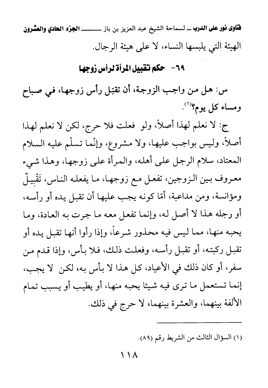 ج: لا نعلم لهذا أصلا، ولو فعلت فلا حرج، لكن لا نعلم لهذا أصلا، وليس بواجب عليها، ولا مشروع، وإنما تسلم عليه السلام المعتاد، سلام الرجل على أهله، والمرأة على زوجها، وهذا شيء معروف بين الزوجين، تفعل مع زوجها، ما يفعله الناس، تقبيل ومؤانسة، ومن مداعبة، أما كونه يجب عليها أن تقبل يده أو رأسه، أو رجله هذا لا أصل له، وإنما تفعل معه ما جرت به العادة، وما يحبه منها، مما ليس فيه محذور شرعا، وإذا رأوا أنها تقبل يده أو تقبل ركبته، أو تقبل رأسه، وفعلت ذلك، فلا بأس، وإذا قدم من سفر، أو كان ذلك في الأعياد، كل هذا لا بأس به، لكن لا يجب، إنما تستعمل ما ترى فيه شيئا يحبه منها، أو يطيب أو يسبب تمام الألفة بينهما، والعشرة بينهما، لا حرج في ذلك.