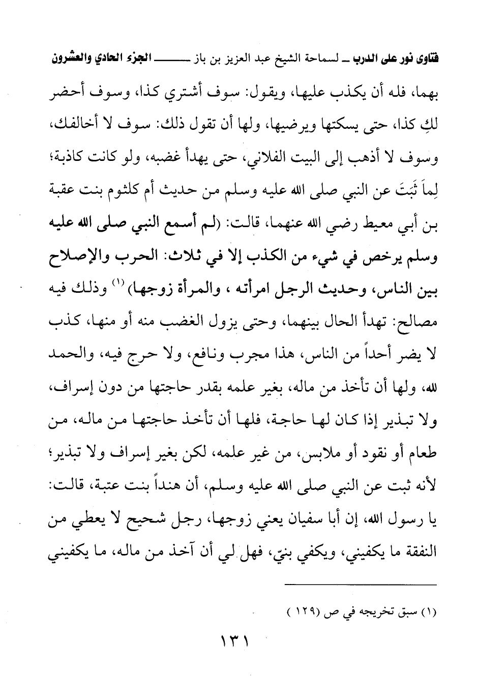 بهما، فله أن يكذب عليها، ويقول: سوف أشتري كذا، وسوف أحضر لك كذا، حتى يسكتها ويرضيها، ولها أن تقول ذلك: سوف لا أخالفك، وسوف لا أذهب إلى البيت الفلاني، حتى يهدأ غضبه، ولو كانت كاذبة؛ لما ثبت عن النبي صلى الله عليه وسلم من حديث أم كلثوم بنت عقبة بن أبي معيط رضي الله عنهما، قالت: «لم أسمع النبي صلى الله عليه وسلم يرخص في شيء من الكذب إلا في ثلاث: الحرب والإصلاح بين الناس، وحديث الرجل امرأته، والمرأة زوجها» (¬1) وذلك فيه مصالح: تهدأ الحال بينهما، وحتى يزول الغضب منه أو منها، كذب لا يضر أحدا من الناس، هذا مجرب ونافع، ولا حرج فيه، والحمد لله، ولها أن تأخذ من ماله، بغير علمه بقدر حاجتها من دون إسراف، ولا تبذير إذا كان لها حاجة، فلها أن تأخذ حاجتها من ماله، من طعام أو نقود أو ملابس، من غير علمه، لكن بغير إسراف ولا تبذير؛ لأنه ثبت عن النبي صلى الله عليه وسلم، أن هندا بنت عتبة، قالت: يا رسول الله، إن أبا سفيان يعني زوجها، رجل شحيح لا يعطي من النفقة ما يكفيني، ويكفي بني، فهل لي أن آخذ من ماله، ما يكفيني