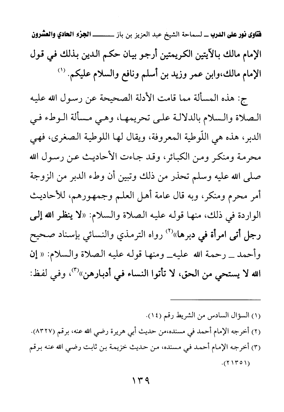 ج: هذه المسألة مما قامت الأدلة الصحيحة عن رسول الله عليه الصلاة والسلام بالدلالة على تحريمها، وهي مسألة الوطء في الدبر، هذه هي اللوطية المعروفة، ويقال لها اللوطية الصغرى، فهي محرمة ومنكر ومن الكبائر، وقد جاءت الأحاديث عن رسول الله صلى الله عليه وسلم تحذر من ذلك وتبين أن وطء الدبر من الزوجة أمر محرم ومنكر، وبه قال عامة أهل العلم وجمهورهم، للأحاديث الواردة في ذلك، منها قوله عليه الصلاة والسلام: «لا ينظر الله إلى رجل أتى امرأة في دبرها» (¬2) رواه الترمذي والنسائي بإسناد صحيح وأحمد –رحمة الله عليه- ومنها قوله عليه الصلاة والسلام: «إن الله لا يستحي من الحق، لا تأتوا النساء في أدبارهن» (¬3) وفي لفظ: