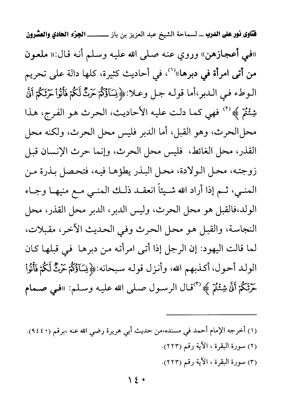 «في أعجازهن» وروي عنه صلى الله عليه وسلم أنه قال: «ملعون من أتى امرأة في دبرها» (¬1) في أحاديث كثيرة، كلها دالة على تحريم الوطء في الدبر، أما قوله جل وعلا: {نِسَاؤُكُمْ حَرْثٌ لَكُمْ فَأْتُوا حَرْثَكُمْ أَنَّى شِئْتُمْ} فهي كما دلت عليه الأحاديث، الحرث هو الفرج، هذا محل الحرث، وهو القبل، أما الدبر فليس محل الحرث، ولكنه محل القذر، محل الغائط، فليس محل الحرث، وإنما حرث الإنسان قبل زوجته، محل الولادة، محل البذر يطؤها فيه، فتحصل بذرة من المني، ثم إذا أراد الله شيئا انعقد ذلك المني مع منيها وجاء الولد، فالقبل هو محل الحرث، وليس الدبر، الدبر محل القذر، محل النجاسة، والقبل هو محل الحرث وفي الحديث الآخر، مقبلات، لما قالت اليهود: إن الرجل إذا أتى امرأته من دبرها في قبلها كان الولد أحول، أكذبهم الله، وأنزل قوله سبحانه: {نِسَاؤُكُمْ حَرْثٌ لَكُمْ فَأْتُوا حَرْثَكُمْ أَنَّى شِئْتُمْ} قال الرسول صلى الله عليه وسلم: «في صمام