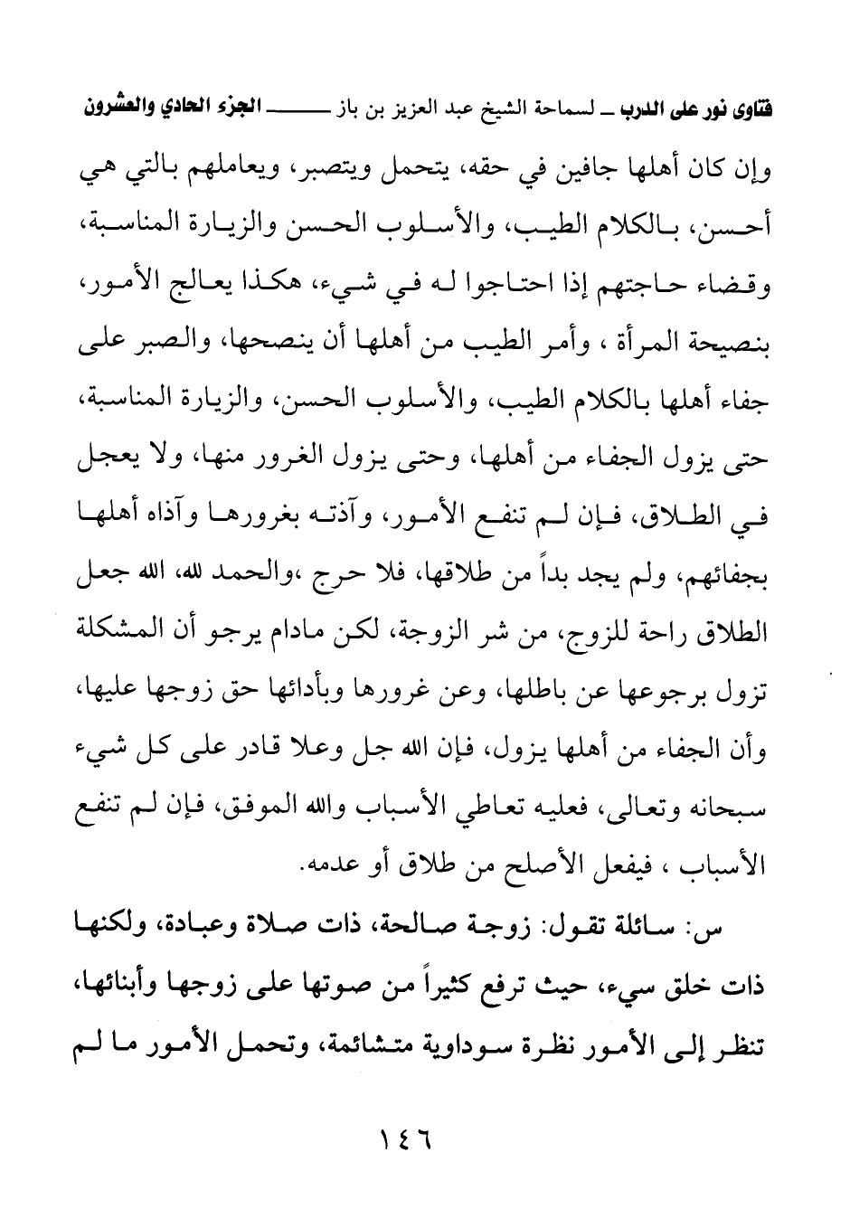 وإن كان أهلها جافين في حقه، يتحمل ويتصبر، ويعاملهم بالتي هي أحسن، بالكلام الطيب، والأسلوب الحسن والزيارة المناسبة، وقضاء حاجتهم إذا احتاجوا له في شيء، هكذا يعالج الأمور، بنصيحة المرأة، وأمر الطيب من أهلها أن ينصحها، والصبر على جفاء أهلها بالكلام الطيب، والأسلوب الحسن، والزيارة المناسبة، حتى يزول الجفاء من أهلها، وحتى يزول الغرور منها، ولا يعجل في الطلاق، فإن لم تنفع الأمور، وآذته بغرورها وآذاه أهلها بجفائهم، ولم يجد بدا من طلاقها، فلا حرج، والحمد لله، الله جعل الطلاق راحة للزوج، من شر الزوجة، لكن ما دام يرجو أن المشكلة تزول برجوعها عن باطلها، وعن غرورها وبأدائها حق زوجها عليها، وأن الجفاء من أهلها يزول، فإن الله جل وعلا قادر على كل شيء سبحانه وتعالى، فعليه تعاطي الأسباب والله الموفق، فإن لم تنفع الأسباب، فيفعل الأصلح من طلاق أو عدمه.