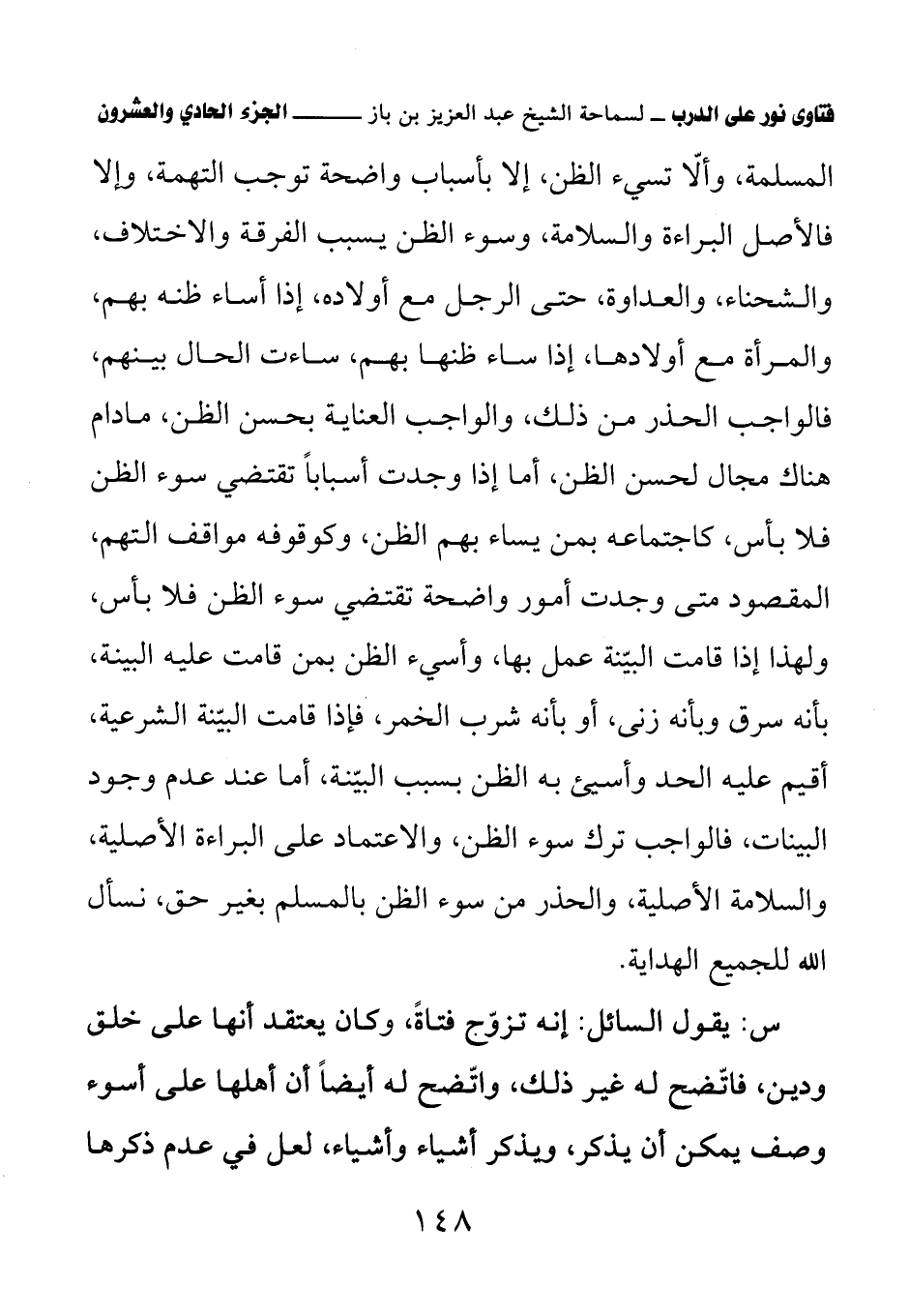 المسلمة، وألا تسيء الظن، إلا بأسباب واضحة توجب التهمة، وإلا فالأصل البراءة والسلامة، وسوء الظن يسبب الفرقة والاختلاف، والشحناء، والعداوة، حتى الرجل مع أولاده، إذا أساء ظنه بهم، والمرأة مع أولادها، إذا ساء ظنها بهم، ساءت الحال بينهم، فالواجب الحذر من ذلك، والواجب العناية بحسن الظن، ما دام هناك مجال لحسن الظن، أما إذا وجدت أسبابا تقتضي سوء الظن فلا بأس، كاجتماعه بمن يساء بهم الظن، وكوقوفه مواقف التهم، المقصود متى وجدت أمور واضحة تقتضي سوء الظن فلا بأس، ولهذا إذا قامت البينة عمل بها، وأسيء الظن بمن قامت عليه البينة، بأنه سرق وبأنه زنى، أو بأنه شرب الخمر، فإذا قامت البينة الشرعية، أقيم عليه الحد وأسيء به الظن بسبب البينة، أما عند عدم وجود البينات، فالواجب ترك سوء الظن، والاعتماد على البراءة الأصلية، والسلامة الأصلية، والحذر من سوء الظن بالمسلم بغير حق، نسأل الله للجميع الهداية.