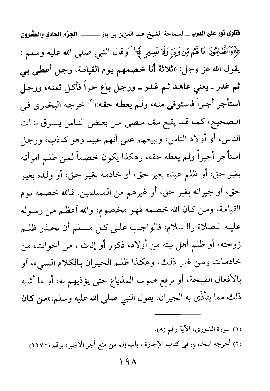 {وَالظَّالِمُونَ مَا لَهُمْ مِنْ وَلِيٍّ وَلا نَصِيرٍ} وقال النبي صلى الله عليه وسلم: يقول الله عز وجل: «ثلاثة أنا خصمهم يوم القيامة، رجل أعطى بي ثم غدر- يعني عاهد ثم غدر- ورجل باع حرا فأكل ثمنه، ورجل استأجر أجيرا فاستوفى منه، ولم يعطه حقه» (¬1) خرجه البخاري في الصحيح، كما قد يقع مما مضى من بعض الناس يسرق بنات الناس، أو أولاد الناس، ويبيعهم على أنهم عبيد وهو كاذب، ورجل استأجر أجيرا ولم يعطه حقه، وهكذا يكون خصما لمن ظلم امرأته بغير حق، أو ظلم عبده بغير حق، أو خادمه بغير حق، أو ولده بغير حق، أو جيرانه بغير حق، أو غيرهم من المسلمين، فالله خصمه يوم القيامة، ومن كان الله خصمه فهو مخصوم، والله أعظم من رسوله عليه الصلاة والسلام، فالواجب على كل مسلم أن يحذر ظلم زوجته، أو ظلم أهل بيته من أولاد، ذكور أو إناث، من أخوات، من خادمات ومن غير ذلك، وهكذا ظلم الجيران بالكلام السيئ، أو بالأفعال القبيحة، أو برفع صوت المذياع حتى يؤذيهم به، أو ما أشبه ذلك مما يتأذى به الجيران، يقول النبي صلى الله عليه وسلم: «من كان