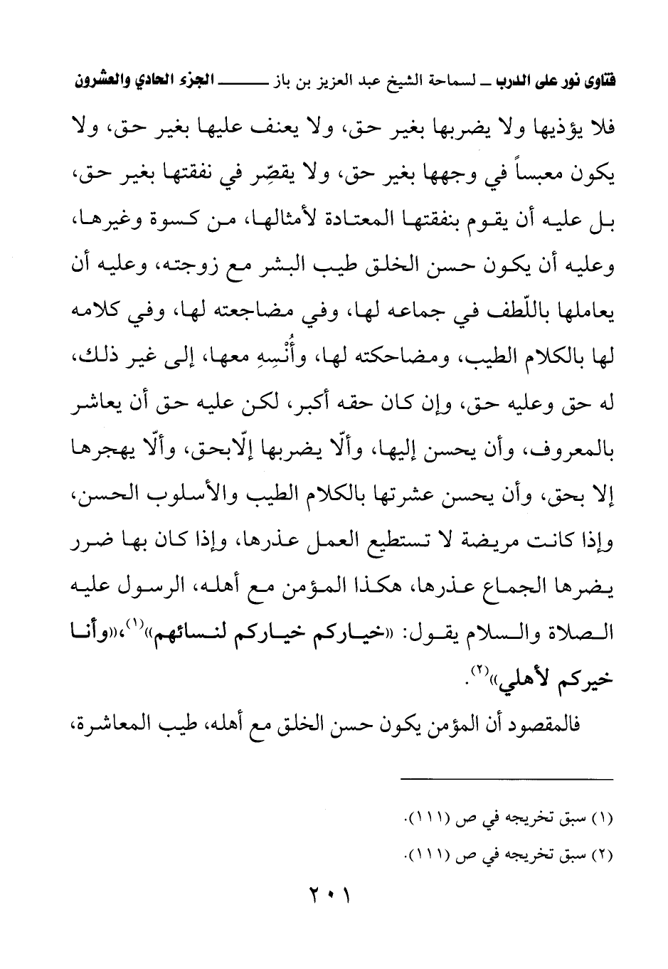 فلا يؤذيها ولا يضربها بغير حق، ولا يعنف عليها بغير حق، ولا يكون معبسا في وجهها بغير حق، ولا يقصر في نفقتها بغير حق، بل عليه أن يقوم بنفقتها المعتادة لأمثالها، من كسوة وغيرها، وعليه أن يكون حسن الخلق طيب البشر مع زوجته، وعليه أن يعاملها باللطف في جماعه لها، وفي مضاجعته لها، وفي كلامه لها بالكلام الطيب، ومضاحكته لها، وأنسه معها، إلى غير ذلك، له حق وعليه حق، وإن كان حقه أكبر، لكن عليه حق أن يعاشر بالمعروف، وأن يحسن إليها، وألا يضربها إلا بحق، وألا يهجرها إلا بحق، وأن يحسن عشرتها بالكلام الطيب والأسلوب الحسن، وإذا كانت مريضة لا تستطيع العمل عذرها، وإذا كان بها ضرر يضرها الجماع عذرها، هكذا المؤمن مع أهله، الرسول عليه الصلاة والسلام يقول: «خياركم خياركم لنسائهم» (¬1) «وأنا خيركم لأهلي» (¬2)