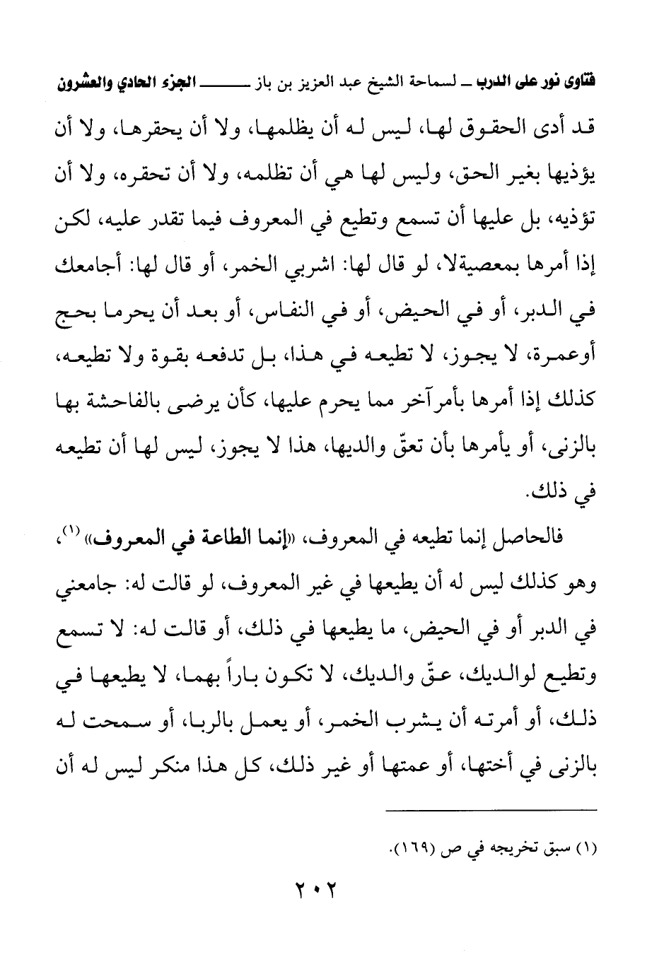 فالحاصل إنما تطيعه في المعروف، «إنما الطاعة في المعروف» (¬1) وهو كذلك ليس له أن يطيعها في غير المعروف، لو قالت له: جامعني في الدبر أو في الحيض، ما يطيعها في ذلك، أو قالت له: لا تسمع وتطيع لوالديك، عق والديك، لا تكون بارا بهما، لا يطيعها في ذلك، أو أمرته أن يشرب الخمر، أو يعمل بالربا، أو سمحت له بالزنى في أختها، أو عمتها أو غير ذلك، كل هذا منكر ليس له أن
