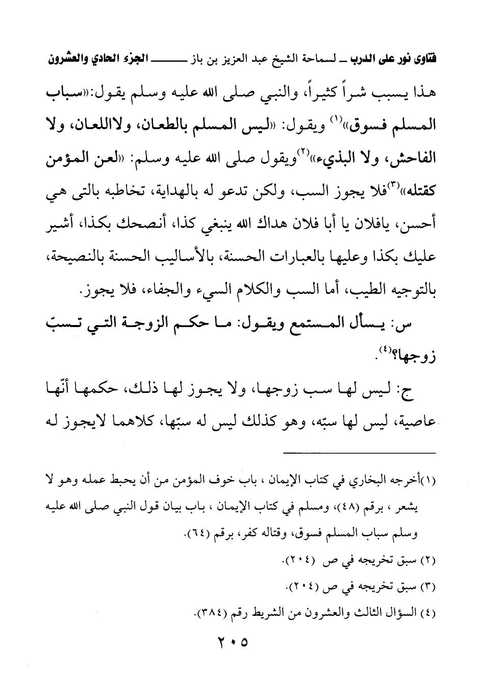 ج: ليس لها سب زوجها، ولا يجوز لها ذلك، حكمها أنها عاصية، ليس لها سبه، وهو كذلك ليس له سبها، كلاهما لا يجوز له