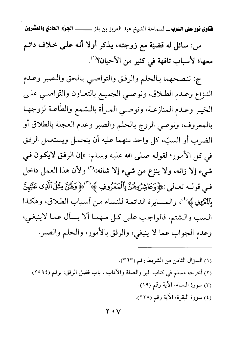 ج: ننصحهما بالحلم والرفق والتواصي بالحق والصبر وعدم النزاع وعدم الطلاق، ونوصي الجميع بالتعاون والتواصي على الخير وعدم المنازعة، ونوصي المرأة بالسمع والطاعة لزوجها بالمعروف، ونوصي الزوج بالحلم والصبر وعدم العجلة بالطلاق أو الضرب أو السب، كل واحد منهما عليه أن يتحمل ويستعمل الرفق في كل الأمور؛ لقوله صلى الله عليه وسلم: «إن الرفق لا يكون في شيء إلا زانه، ولا ينزع من شيء إلا شانه» (¬2) ولأن هذا العمل داخل في قوله تعالى: {وَعَاشِرُوهُنَّ بِالْمَعْرُوفِ}، {وَلَهُنَّ مِثْلُ الَّذِي عَلَيْهِنَّ بِالْمَعْرُوفِ}، والمسايرة الدائمة للنساء من أسباب الطلاق، وهكذا السب والشتم، فالواجب على كل منهما ألا يسأل عما لا ينبغي، وعدم الجواب عما لا ينبغي، والرفق بالأمور، والحلم والصبر.
