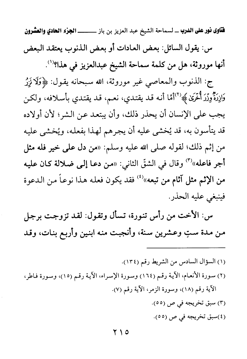 ج: الذنوب والمعاصي غير موروثة، الله سبحانه يقول: {وَلا تَزِرُ وَازِرَةٌ وِزْرَ أُخْرَى} أما أنه قد يقتدي، نعم، قد يقتدي بأسلافه، ولكن يجب على الإنسان أن يحذر ذلك، وأن يبتعد عن الشر؛ لأن أولاده قد يتأسون به، قد يُخشى عليه أن يجرهم لهذا بفعله، ويُخشى عليه من إثم ذلك؛ لقوله صلى الله عليه وسلم: «من دل على خير فله مثل أجر فاعله» (¬2) وقال في الشق الثاني: «من دعا إلى ضلالة كان عليه من الإثم مثل آثام من تبعه» (¬3) فقد يكون فعله هذا نوعا من الدعوة فينبغي عليه الحذر.