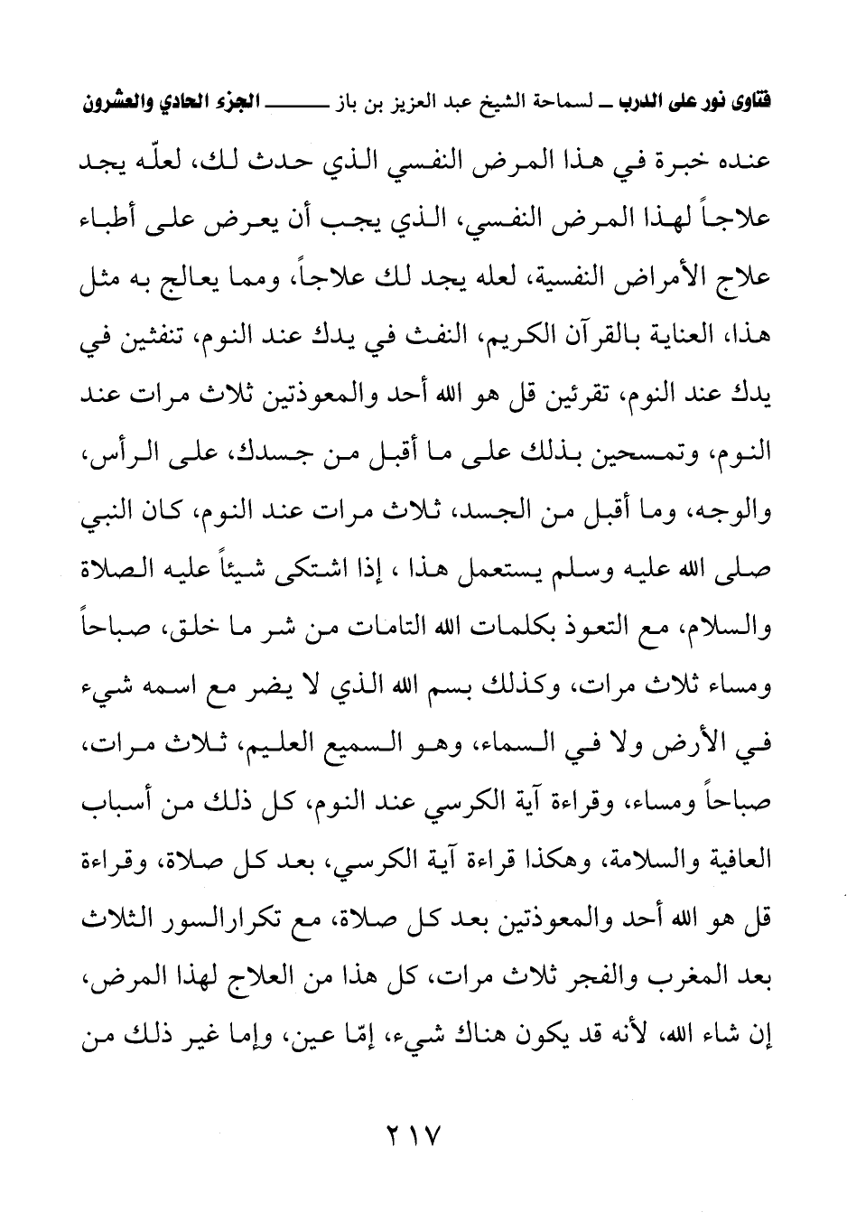 عنده خبرة في هذا المرض النفسي الذي حدث لك، لعله يجد علاجا لهذا المرض النفسي، الذي يجب أن يعرض على أطباء علاج الأمراض النفسية، لعله يجد لك علاجا، ومما يعالج به مثل هذا، العناية بالقرآن الكريم، النفث في يدك عند النوم، تنفثين في يدك عند النوم، تقرئين قل هو الله أحد والمعوذتين ثلاث مرات عند النوم، وتمسحين بذلك على ما أقبل من جسدك، على الرأس، والوجه، وما أقبل من الجسد، ثلاث مرات عند النوم، كان النبي صلى الله عليه وسلم يستعمل هذا، إذا اشتكى شيئا عليه الصلاة والسلام، مع التعوذ بكلمات الله التامات من شر ما خلق، صباحا ومساء ثلاث مرات، وكذلك بسم الله الذي لا يضر مع اسمه شيء في الأرض ولا في السماء، وهو السميع العليم، ثلاث مرات، صباحا ومساء، وقراءة آية الكرسي عند النوم، كل ذلك من أسباب العافية والسلامة، وهكذا قراءة آية الكرسي، بعد كل صلاة، وقراءة قل هو الله أحد والمعوذتين بعد كل صلاة، مع تكرار السور الثلاث بعد المغرب والفجر ثلاث مرات، كل هذا من العلاج لهذا المرض، إن شاء الله، لأنه قد يكون هناك شيء، إما عين، وإما غير ذلك من