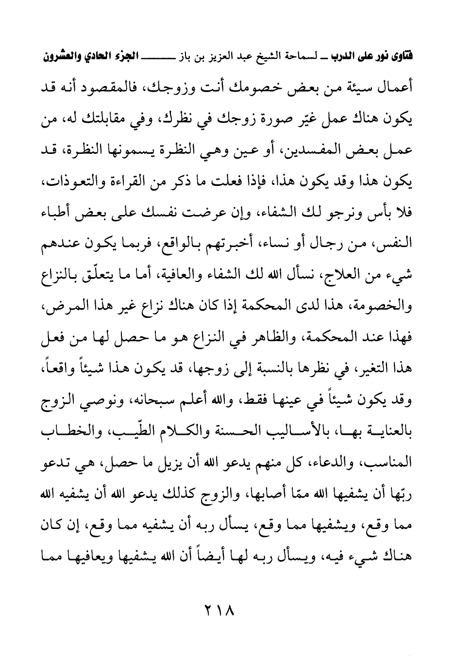 أعمال سيئة من بعض خصومك أنت وزوجك، فالمقصود أنه قد يكون هناك عمل غَيَّر صورة زوجك في نظرك، وفي مقابلتك له، من عمل بعض المفسدين، أو عين وهي النظرة يسمونها النظرة، د يكون هذا وقد يكون هذا، فإذا فعلت ما ذكر من القراءة والتعوذات، فلا بأس ونرجو لك الشفاء، وإن عرضت نفسك على بعض أطباء النفس، من رجال أو نساء، أخبرتهم بالواقع، فربما يكون عندهم شيء من العلاج، نسأل الله لك الشفاء والعافية، أما ما يتعلق بالنزاع والخصومة، هذا لدى المحكمة إذا كان هناك نزاع غير هذا المرض، فهذا عند المحكمة، والظاهر في النزاع هو ما حصل لها من فعل هذا التغير، في نظرها بالنسبة إلى زوجها، قد يكون هذا شيئا واقعا، وقد يكون شيئا في عينها فقط، والله أعلم سبحانه، ونوصي الزوج بالعناية بها، بالأساليب الحسنة والكلام الطيب، والخطاب المناسب، والدعاء، كل منهم يدعو الله أن يزيل ما حصل، هي تدعو ربها أن يشفيها الله مما أصابها، والزوج كذلك يدعو الله أن يشفيه الله مما وقع، ويشفيها مما وقع، يسأل ربه أن يشفيه مما وقع، إن كان هناك شيء فيه، ويسأل ربه لها أيضا أن الله يشفيها ويعافيها مما