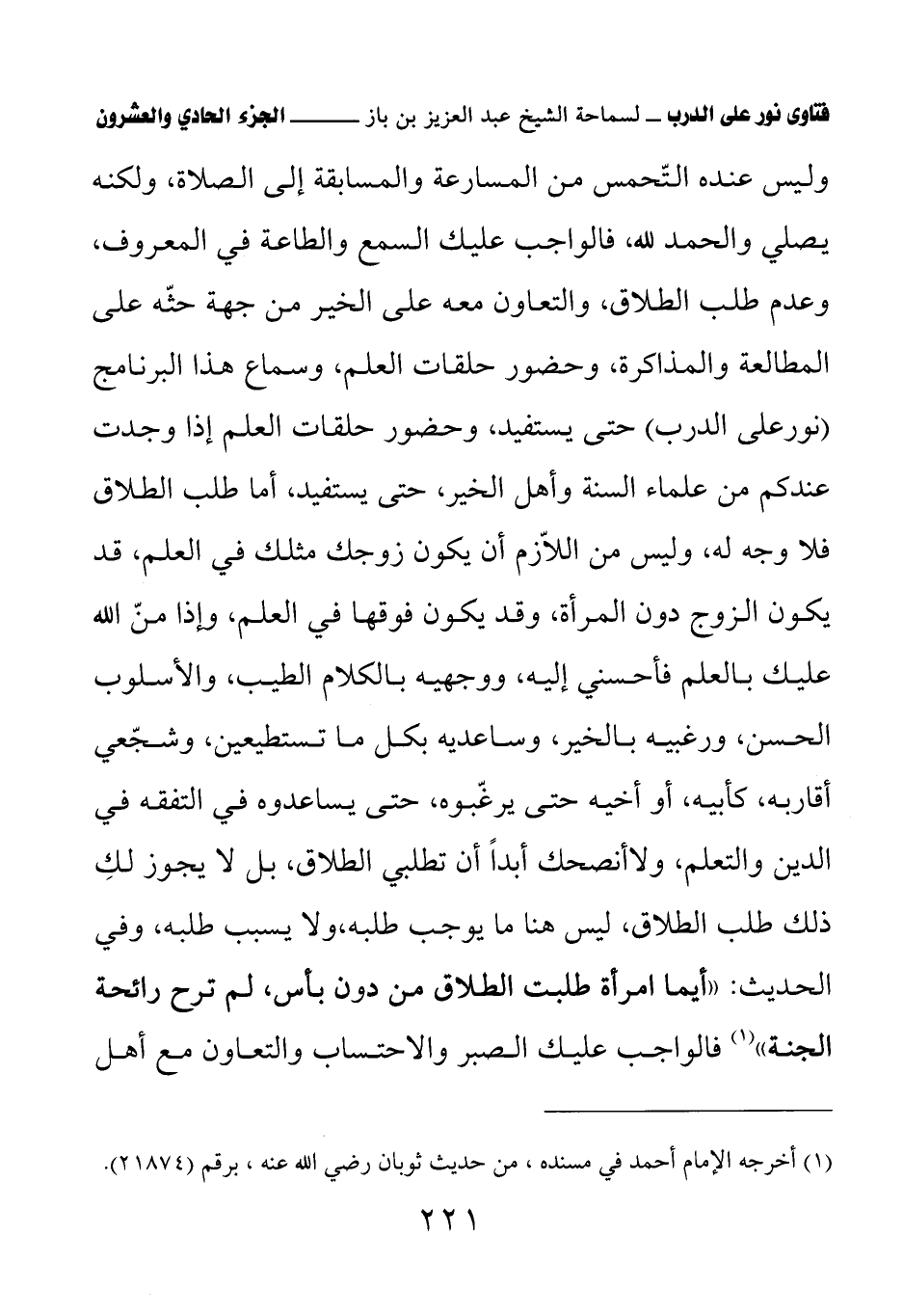 وليس عنده التحمس من المسارعة والمسابقة إلى الصلاة، ولكنه يصلي والحمد لله، فالواجب عليك السمع والطاعة في المعروف، وعدم طلب الطلاق، والتعاون معه على الخير من جهة حثه على المطالعة والمذاكرة، وحضور حلقات العلم، وسماع هذا البرنامج (نور على الدرب) حتى يستفيد، وحضور حلقات العلم إذا وجدت عندكم من علماء السنة وأهل الخير، حتى يستفيد، أما طلب الطلاق فلا وجه له، وليس من اللازم أن يكون زوجك مثلك في العلم، قد يكون الزوج دون المرأة، وقد يكون فوقها في العلم، وإذا من الله عليك بالعلم فأحسني إليه، ووجهيه بالكلام الطيب، والأسلوب الحسن، ورغبيه بالخير، وساعديه بكل ما تستطيعين، وشجعي أقاربه، كأبيه، أو أخيه حتى يرغبوه، حتى يساعدوه في التفقه في الدين والتعلم، ولا أنصحك أبدا أن تطلبي الطلاق، بل لا يجوز لك ذلك طلب الطلاق، ليس هنا ما يوجب طلبه، ولا يسبب طلبه، وفي الحديث: «أيما امرأة طلبت الطلاق من دون بأس، لم ترح رائحة الجنة» (¬1) فالواجب عليك الصبر والاحتساب والتعاون مع أهل