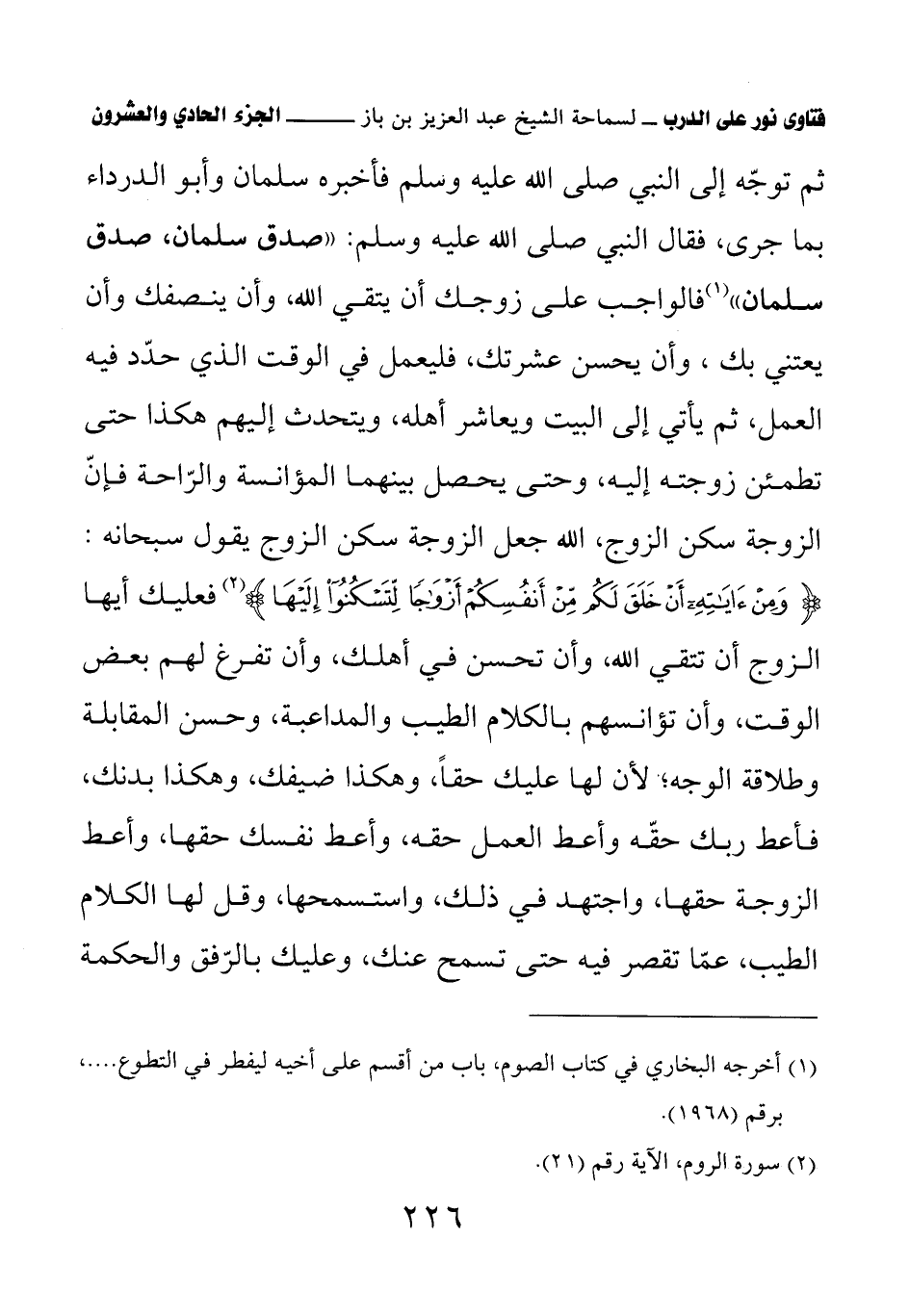 ثم توجه إلى النبي صلى الله عليه وسلم فأخبره سلمان وأبو الدرداء بما جرى، فقال النبي صلى الله عليه وسلم: «صدق سلمان، صدق سلمان» (¬1) فالواجب على زوجك أن يتقي الله، وأن ينصفك وأن يعتني بك، وأن يحسن عشرتك، فليعمل في الوقت الذي حدد فيه العمل، ثم يأتي إلى البيت ويعاشر أهله، ويتحدث إليهم هكذا حتى تطمئن زوجته إليه، وحتى يحصل بينهما المؤانسة والراحة فإن الزوجة سكن الزوج، الله جعل الزوجة سكن الزوج يقول سبحانه: {وَمِنْ آيَاتِهِ أَنْ خَلَقَ لَكُمْ مِنْ أَنْفُسِكُمْ أَزْوَاجًا لِتَسْكُنُوا إِلَيْهَا} فعليك أيها الزوج أن تتقي الله، وأن تحسن في أهلك، وأن تفرغ لهم بعض الوقت، وأن تؤانسهم بالكلام الطيب والمداعبة، وحسن المقابلة وطلاقة الوجه؛ لأن لها عليك حقا، وهكذا ضيفك، وهكذا بدنك، فأعط ربك حقه وأعط العمل حقه، وأعط نفسك حقها، وأعط الزوجة حقها، واجتهد في ذلك، واستسمحها، وقل لها الكلام الطيب، عما تقصر فيه حتى تسمح عنك، وعليك بالرفق والحكمة
