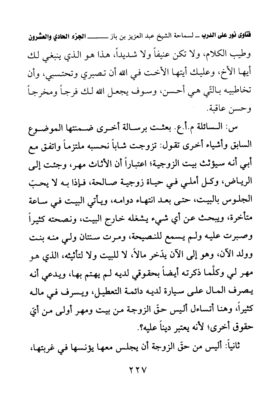 س: السائلة م. أ. ع. بعثت برسالة أخرى ضمنتها الموضوع السابق وأشياء أخرى تقول: تزوجت شابا نحسبه ملتزما واتفق مع أبي أنه سيؤثث بيت الزوجية؛ اعتبارا أن الأثاث مهر، وجئت إلى الرياض، وكل أملي في حياة زوجية صالحة، فإذا به لا يحب الجلوس بالبيت، حتى بعد انتهاء دوامه، ويأتي البيت في ساعة متأخرة، ويبحث عن أي شيء يشغله خارج البيت، ونصحته كثيرا وصبرت عليه ولم يسمع للنصيحة، ومرت سنتان ولي منه بنت وولد الآن، وهو إلى الآن يدخر مالا، لا للبيت ولا لتأثيثه، الذي هو مهر لي وكلما ذكرته أيضا بحقوقي لديه لم يهتم بها، ويدعي أنه يصرف المال على سيارة لديه دائمة التعطيل، ويسرف في ماله كثيرا، وهنا أتساءل أليس حق الزوجة من بيت ومهر أولى من أي حقوق أخرى؛ لأنه يعتبر دينا عليه.؟.