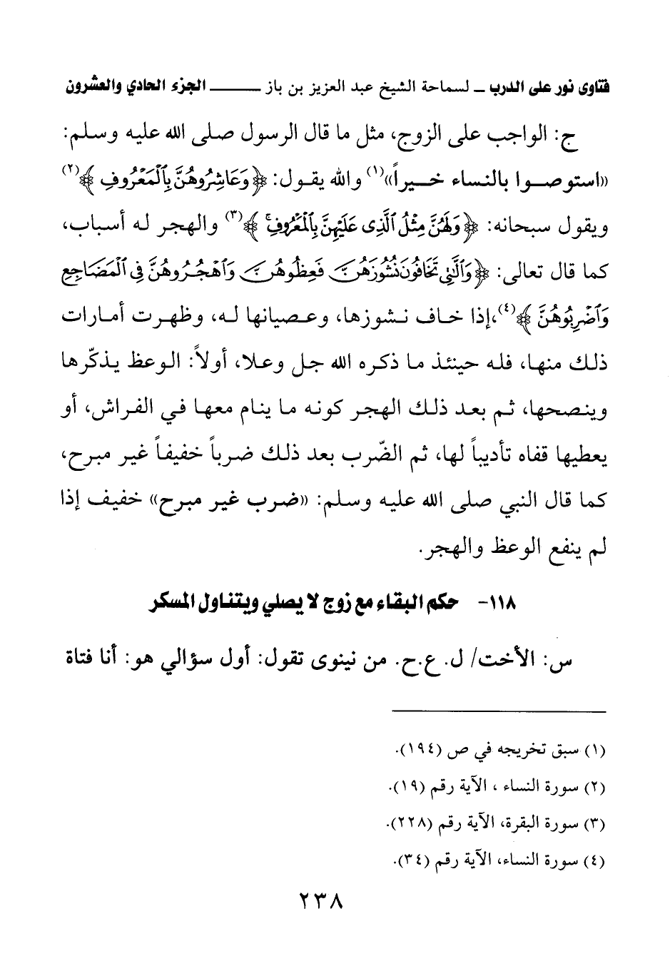 ج: الواجب على الزوج، مثل ما قال الرسول صلى الله عليه وسلم: «استوصوا بالنساء خيرا» (¬1) والله يقول: {وَعَاشِرُوهُنَّ بِالْمَعْرُوفِ} ويقول سبحانه: {وَلَهُنَّ مِثْلُ الَّذِي عَلَيْهِنَّ بِالْمَعْرُوفِ} والهجر له أسباب، كما قال تعالى: {وَاللاتِي تَخَافُونَ نُشُوزَهُنَّ فَعِظُوهُنَّ وَاهْجُرُوهُنَّ فِي الْمَضَاجِعِ وَاضْرِبُوهُنَّ}، إذا خاف نشوزها، وعصيانها له، وظهرت أمارات ذلك منها، فله حينئذ ما ذكره الله جل وعلا، أولا: الوعظ يذكرها وينصحها، ثم بعد ذلك الهجر كونه ما ينام معها في الفراش، أو يعطيها قفاه تأديبا لها، ثم الضرب بعد ذلك ضربا خفيفا غير مبرح، كما قال النبي صلى الله عليه وسلم: «ضرب غير مبرح» (¬2) خفيف إذا لم ينفع الوعظ والجهر.