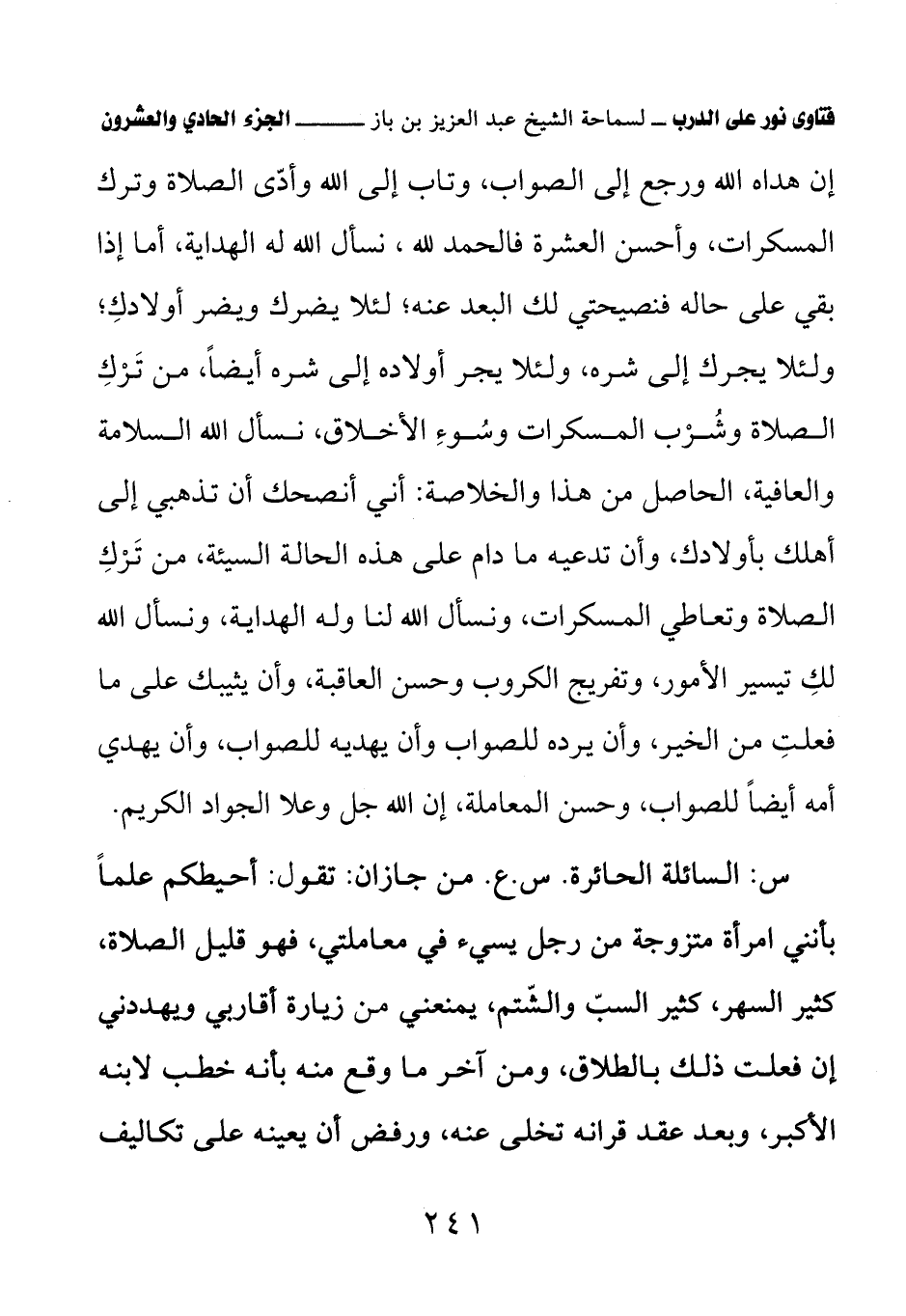 س: السائلة الحائرة. س. ع. من جازان: تقول: أحيطكم علما بأنني امرأة متزوجة من رجل يسيء في معاملتي، فهو قليل الصلاة، كثير السهر، كثير السب والشتم، يمنعني من زيارة أقاربي ويهددني إن فعلت ذلك بالطلاق، ومن آخر ما وقع منه بأنه خطب لابنه الأكبر، وبعد عقد قرانه تخلى عنه، ورفض أن يعينه على تكاليف