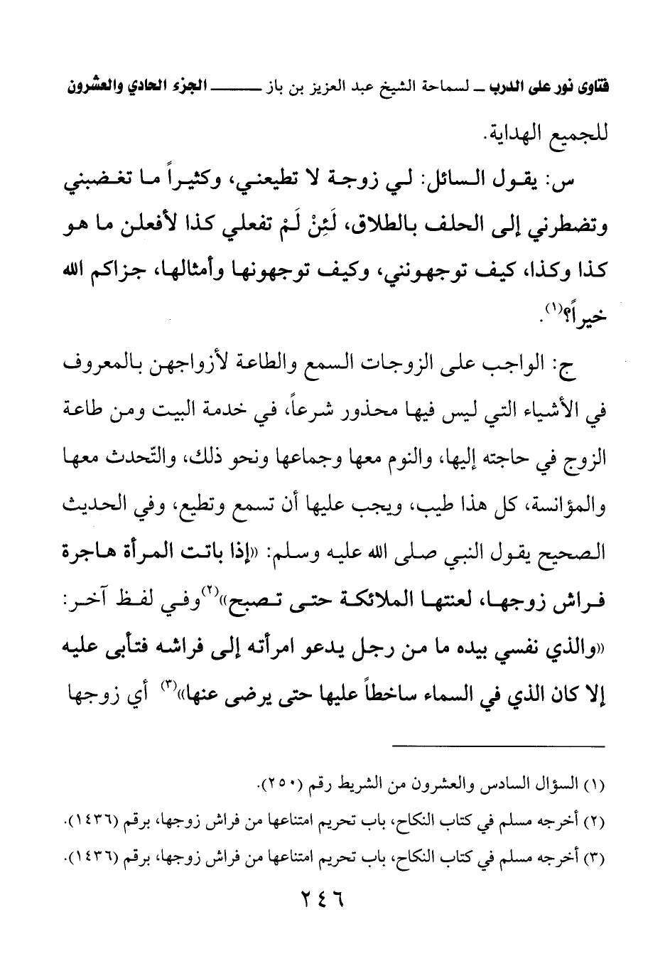 (¬3) أخرجه مسلم في كتاب النكاح، باب تحريم امتناعها من فراش زوجها، برقم (1436).