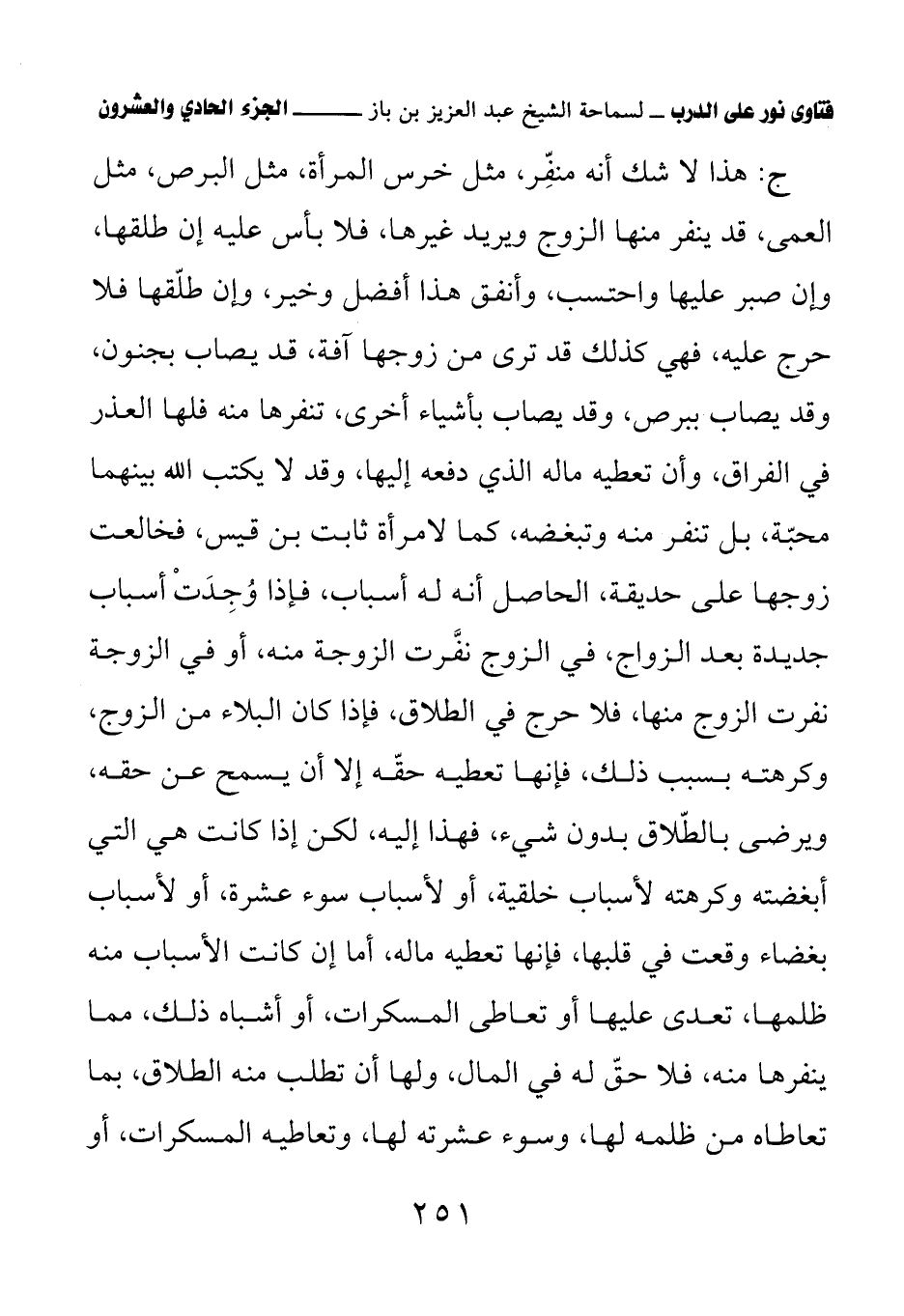 ج: هذا لا شك أنه منفر، مثل خرس المرأة، مثل البرص، مثل العمى، قد ينفر منها الزوج ويريد غيرها، فلا بأس عليه إن طلقها، وإن صبر عليها واحتسب، وأنفق هذا أفضل وخير، وإن طلقها فلا حرج عليه، فهي كذلك قد ترى من زوجها آفة، قد يصاب بجنون، وقد يصاب ببرص، وقد يصاب بأشياء أخرى، تنفرها منه فلها العذر في الفراق، وأن تعطيه ماله الذي دفعه إليها، وقد لا يكتب الله بينهما محبة، بل تنفر منه وتبغضه، كما لامرأة ثابت بن قيس، فخالعت زوجها على حديقة، الحاصل أنه له أسباب، فإذا وجدت أسباب جديدة بعد الزواج، في الزوج نفرت الزوجة منه، أو في الزوجة نفرت الزوج منها، فلا حرج في الطلاق، فإذا كان البلاء من الزوج، وكرهته بسبب ذلك، فإنها تعطيه حقه إلا أن يسمح عن حقه، ويرضى بالطلاق بدون شيء، فهذا إليه، لكن إذا كانت هي التي أبغضته وكرهته لأسباب خلقية، أو لأسباب سوء عشرة، أو لأسباب بغضاء وقعت في قلبها، فإنها تعطيه ماله، أما إن كانت الأسباب منه ظلمها، تعدى عليها أو تعاطى المسكرات، أو أشباه ذلك، مما ينفرها منه، فلا حق له في المال، ولها أن تطلب منه الطلاق، بما تعاطاه من ظلمه لها، وسوء عشرته لها، وتعاطيه المسكرات، أو