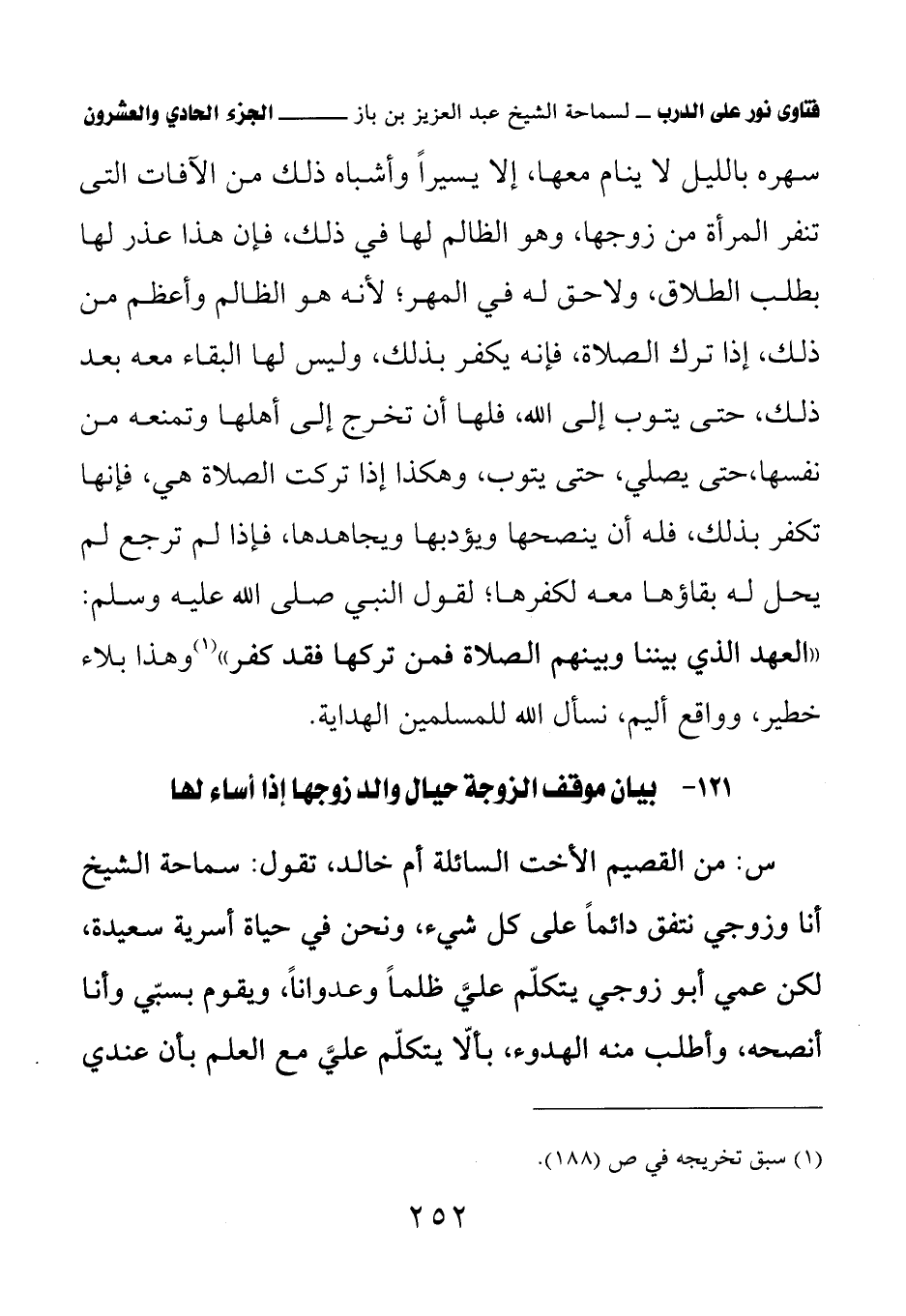 سهره بالليل لا ينام معها، إلا يسيرا وأشباه ذلك من الآفات التي تنفر المرأة من زوجها، وهو الظالم لها في ذلك، فإن هذا عذر لها بطلب الطلاق، ولا حق له في المهر؛ لأنه هو الظالم وأعظم من ذلك، إذا ترك الصلاة، فإنه يكفر بذلك، وليس لها البقاء معه بعد ذلك، حتى يتوب إلى الله، فلها أن تخرج إلى أهلها وتمنعه من نفسها، حتى يصلي، حتى يتوب، وهكذا إذا تركت الصلاة هي، فإنها تكفر بذلك، فله أن ينصحها ويؤدبها ويجاهدها، فإذا لم ترجع لم يحل له بقاؤها معه لكفرها؛ لقول النبي صلى الله عليه وسلم: «العهد الذي بيننا وبينهم الصلاة فمن تركها فقد كفر» (¬1) وهذا بلاء خطير، وواقع أليم، نسأل الله للمسلمين الهداية.