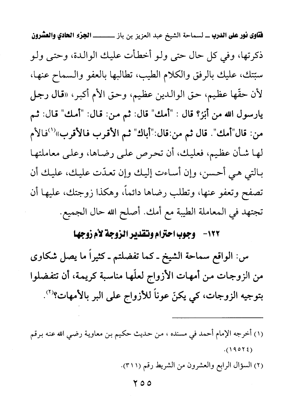 ذكرتها، وفي كل حال حتى ولو أخطأت عليك الوالدة، وحتى ولو سبتك، عليك بالرفق والكلام الطيب، تطالبها بالعفو والسماح عنها، لأن حقها عظيم، حق الوالدين عظيم، وحق الأم أكبر، «قال رجل يا رسول الله من أبر؟ قال: "أمك" قال: ثم من؟ قال: "أمك" قال: ثم من: قال "أمك". قال ثم من: قال: "أباك" ثم الأقرب فالأقرب» (¬1) فالأم لها شأن عظيم فعليك، أن تحرص على رضاها، وعلى معاملتها بالتي هي أحسن، وإن أساءت إليك وإن تعدت عليك، عليك أن تصفح وتعفو عنها، وتطلب رضاها دائما، وهكذا زوجتك، عليها أن تجتهد في المعاملة الطيبة مع أمك. أصلح الله حال الجميع.