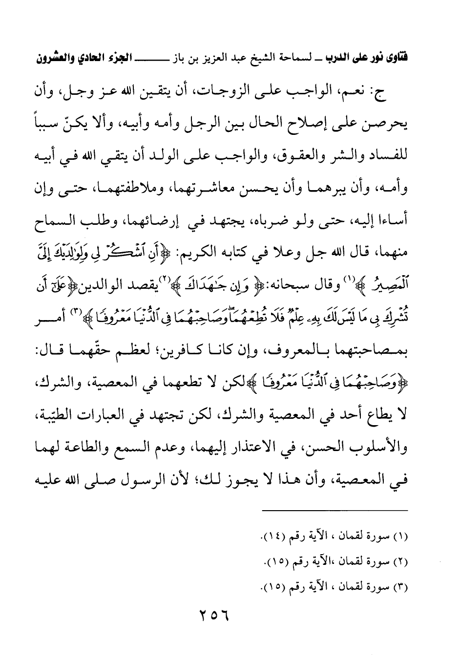 ج: نعم، الواجب على الزوجات، أن يتقين الله عز وجل، وأن يحرصن على إصلاح الحال بين الرجل وأمه وأبيه، وألا يكن سببا للفساد والشر والعقوق، والواجب على الولد أن يتقي الله في أبيه وأمه، وأن يبرهما وأن يحسن معاشرتهما، وملاطفتهما، حتى وإن أساءا إليه، حتى ولو ضرباه، يجتهد في إرضائهما، وطلب السماح منهما، قال الله جل وعلا في كتابه الكريم: {أَنِ اشْكُرْ لِي وَلِوَالِدَيْكَ إِلَيَّ الْمَصِيرُ} وقال سبحانه: {وَإِنْ جَاهَدَاكَ} يقصد الوالدين: {عَلَى أَنْ تُشْرِكَ بِي مَا لَيْسَ لَكَ بِهِ عِلْمٌ فَلا تُطِعْهُمَا وَصَاحِبْهُمَا فِي الدُّنْيَا مَعْرُوفًا} أمر بمصاحبتهما بالمعروف، وإن كانا كافرين؛ لعظم حقهما قال: {وَصَاحِبْهُمَا فِي الدُّنْيَا مَعْرُوفًا} لكن لا تطعهما في المعصية، والشرك، لا يطاع أحد في المعصية والشرك، لكن تجتهد في العبارات الطيبة، والأسلوب الحسن، في الاعتذار إليهما، وعدم السمع والاعة لهما في المعصية، وأن هذا لا يجوز لك؛ لأن الرسول صلى الله عليه