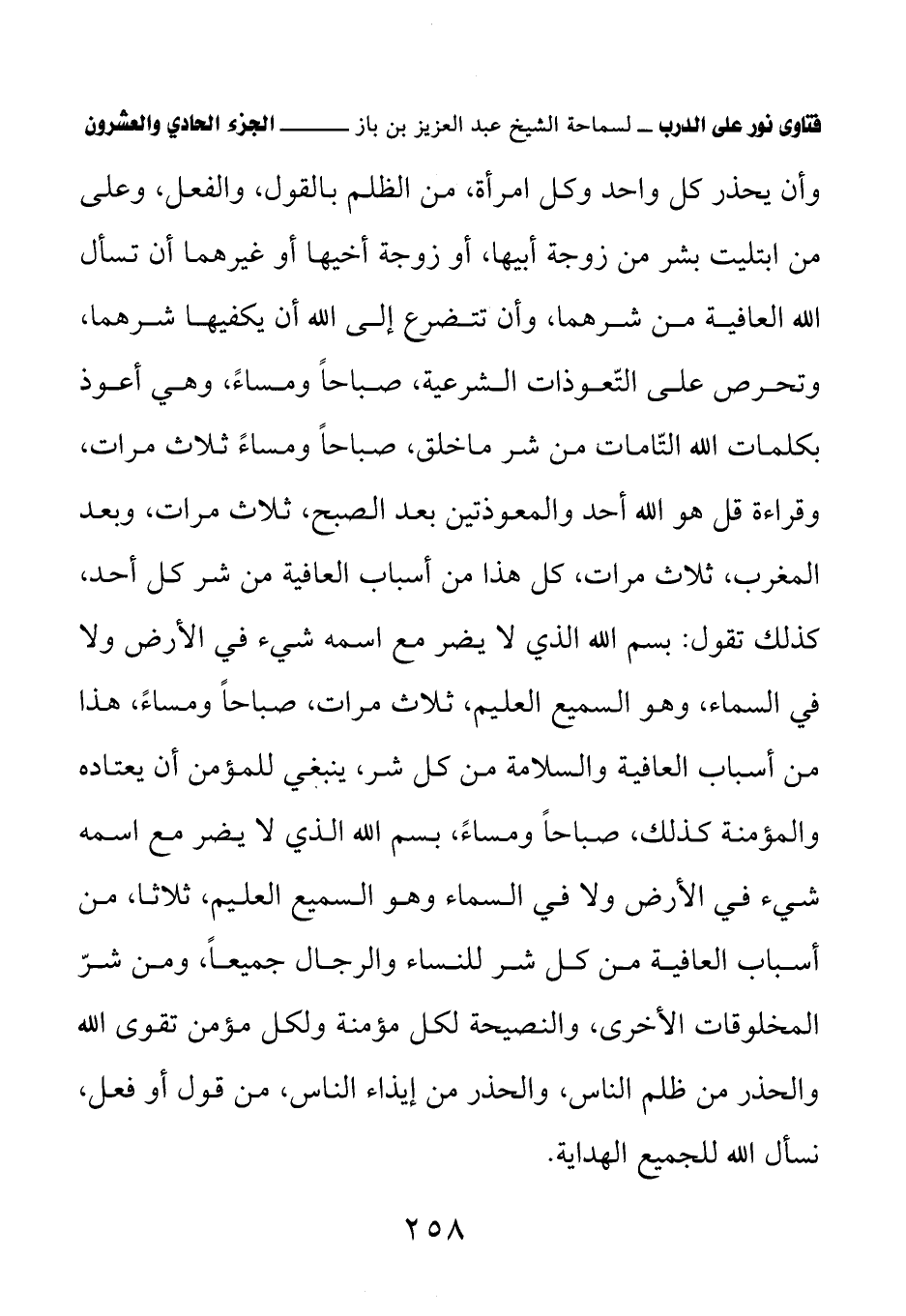 وأن يحذر كل واحد وكل امرأة، من الظلم بالقول، والفعل، وعلى من ابتليت بشر من زوجة أبيها، أو زوجة أخيها أو غيرهما أن تسأل الله العافية من شرهما، وأن تتضرع إلى الله أن يكفيها شرهما، وتحرص على التعوذات الشرعية، صباحا ومساء، وهي أعوذ بكلمات الله التامات من شر ما خلق، صباحا ومساء ثلاث مرات، وقراءة قل هو الله أحد والمعوذتين بعد الصبح، ثلاث مرات، وبعد المغرب، ثلاث مرات، كل هذا من أسباب العافية من شر كل أحد، كذلك تقول: بسم الله الذي لا يضر مع اسمه شيء في الأرض ولا في السماء، وهو السميع العليم، ثلاث مرات، صباحا ومساء، هذا من أسباب العافية والسلامة من كل شر، ينبغي للمؤمن أن يعتاده والمؤمنة كذلك، صباحا ومساء، بسم الله الذي لا يضر مع اسمه شيء في الأرض ولا في السماء وهو السميع العليم، ثلاثا، من أسباب العافية من كل شر للنساء والرجال جميعا، ومن شر المخلوقات الأخرى، والنصيحة لكل مؤمنة ولكل مؤمن تقوى الله والحذر من ظلم الناس، والحذر من إيذاء الناس، من قول أو فعل، نسأل الله للجميع الهداية.