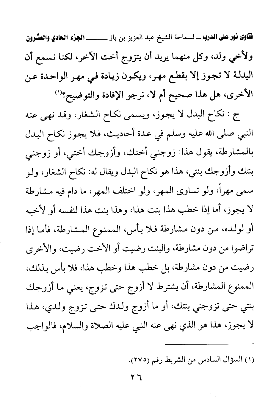 ج: نكاح البدل لا يجوز، ويسمى نكاح الشغار، وقد نهى عنه النبي صلى الله عليه وسلم في عدة أحاديث، فلا يجوز نكاح البدل بالمشارطة، يقول هذا: زوجني أختك، وأزوجك أختي، أو زوجني بنتك وأزوجك بنتي، هذا هو نكاح البدل ويقال له: نكاح الشغار، ولو سمى مهرا، ولو تساوى المهر، ولو اختلف المهر، ما دام فيه مشارطة لا يجوز، أما إذا خطب هذا بنت هذا، وهذا بنت هذا لنفسه أو لأخيه أو لولده، من دون مشارطة فلا بأس، الممنوع المشارطة، فأما إذا تراضوا من دون مشارطة، والبنت رضيت أو الأخت رضيت، والأخرى رضيت من دون مشارطة، بل خطب هذا وخطب هذا، فلا بأس بذلك، الممنوع المشارطة، أن يشترط لا أزوج حتى تزوج، يعني ما أزوجك بنتي حتى تزوجني بنتك، أو ما أزوج ولدك حتى تزوج ولدي، هذا لا يجوز، هذا هو الذي نهى عنه النبي عليه الصلاة والسلام، فالواجب