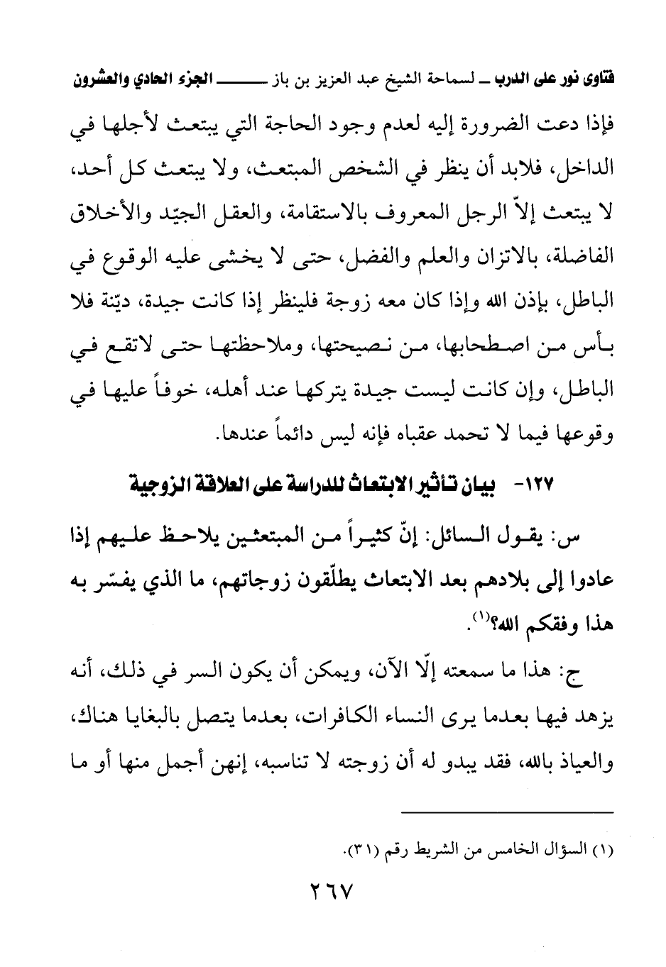 س: يقول السائل: إن كثيرا من المبتعثين يلاحظ عليهم إذا عادوا إلى بلادهم بعد الابتعاث يطلقون زوجاتهم، ما الذي يفسر به هذا وفقكم الله؟ (¬1)