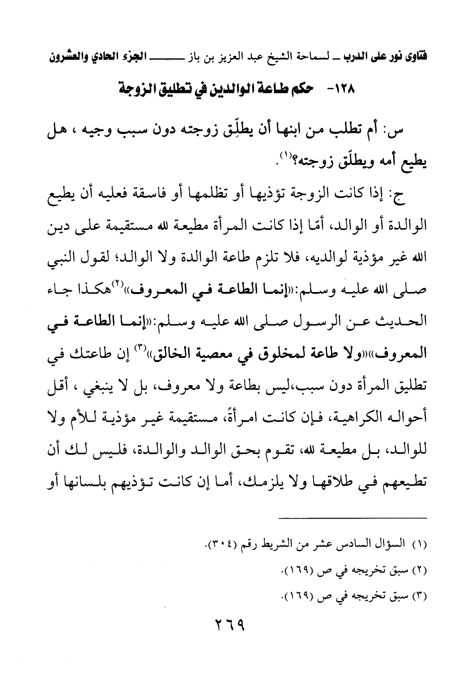 ج: إذا كانت الزوجة تؤذيها أو تظلمها أو فاسقة فعليه أن يطيع الوالدة أو الوالد، أما إذا كانت المرأة مطيعة لله مستقيمة على دين الله غير مؤذية لوالديه، فلا تلزم طاعة الوالدة ولا الوالد؛ لقول النبي صلى الله عليه وسلم: «إنما الطاعة في المعروف» (¬2) هكذا جاء الحديث عن الرسول صلى الله عليه وسلم: «إنما الطاعة في المعروف» (¬3)، «ولا طاعة لمخلوق في معصية الخالق» (¬4) إن طاعتك في تطليق المرأة دون سبب، ليس بطاعة ولا معروف، بل لا ينبغي، أقل أحواله الكراهية، فإن كانت امرأة، مستقيمة غير مؤذية للأم ولا للوالد، بل مطيعة لله، تقوم بحق الوالد والوالدة، فليس لك أن تطيعهم في طلاقها ولا يلزمك، أما إن كانت تؤذيهم بلسانها أو