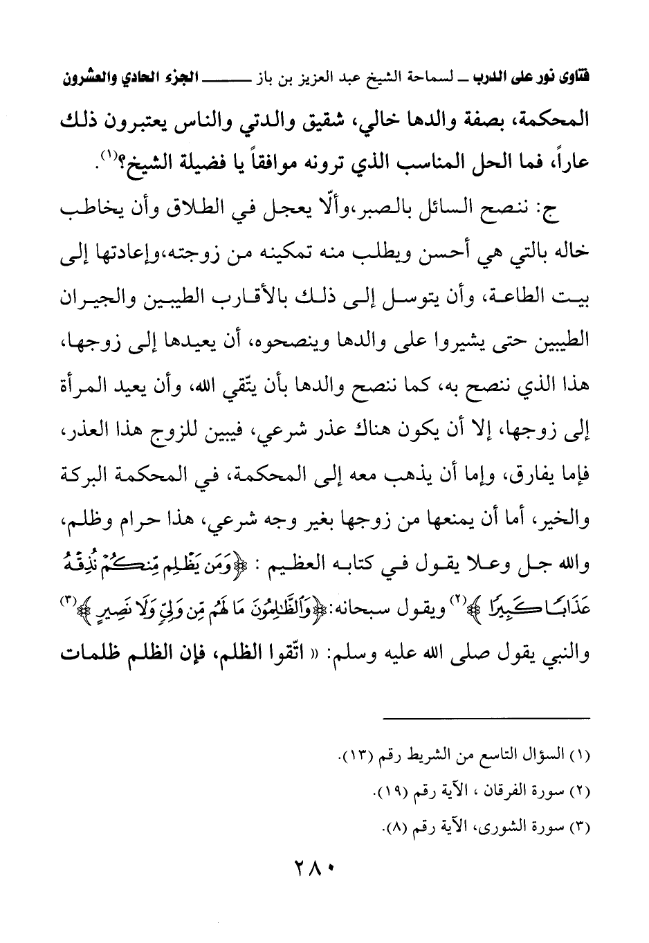 ج: ننصح السائل بالصبر، وألا يعجل في الطلاق وأن يخاطب خاله بالتي هي أحسن ويطلب منه تمكينه من زوجته، وإعادتها إلى بيت الطاعة، وأن يتوسل إلى ذلك بالأقارب الطيبين والجيران الطيبين حتى يشيروا على والدها وينصحوه، أن يعيدها إلى زوجها، هذا الذي ننصح به، كما ننصح والدها بأن يتقي الله، وأن يعيد المرأة إلى زوجها، إلا أن يكون هناك عذر شرعي، فيبين للزوج هذا العذر، فإما يفارق، وإما أن يذهب معه إلى المحكمة، في المحكمة البركة والخير، أما أن يمنعها من زوجها بغير وجه شرعي، هذا حرام وظلم، والله جل وعلا يقول في كتابه العظيم: {وَمَنْ يَظْلِمْ مِنْكُمْ نُذِقْهُ عَذَابًا كَبِيرًا} ويقول سبحانه: {وَالظَّالِمُونَ مَا لَهُمْ مِنْ وَلِيٍّ وَلا نَصِيرٍ} والنبي يقول صلى الله عليه وسلم: «اتقوا الظلم، فإن الظلم ظلمات