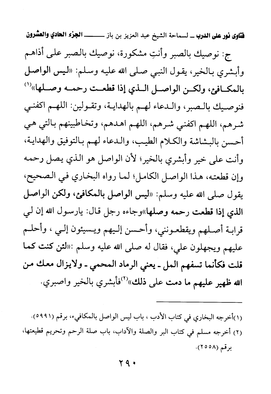 ج: نوصيك بالصبر وأنت مشكورة، نوصيك بالصبر على أذاهم وأبشري بالخير، يقول النبي صلى الله عليه وسلم: «ليس الواصل بالمكافئ، ولكن الواصل الذي إذا قطعت رحمه وصلها» (¬1) فنوصيك بالصبر، والدعاء لهم بالهداية، وتقولين: اللهم اكفني شرهم، اللهم اكفني شرهم، اللهم اهدهم، وتخاطبينهم بالتي هي أحسن بالبشاشة والكلام الطيب، والدعاء لهم بالتوفيق والهداية، وأنت على خير وأبشري بالخير؛ لأن الواصل هو الذي يصل رحمه وإن قطعته، هذا الواصل الكامل؛ لما رواه البخاري في الصحيح، يقول صلى الله عليه وسلم: «ليس الواصل بالمكافئ، ولكن الواصل الذي إذا قطعت رحمه وصلها» (¬2) وجاءه رجل قال: يا رسول الله إن لي قرابة أصلهم ويقطعونني، وأحسن إليهم ويسيئون إلي، وأحلم عليهم ويجهلون علي، فقال له صلى الله عليه وسلم: «لئن كنت كما قلت فكأنما تسفهم المل- يعني الرماد المحمي- ولا يزال معك من الله ظهير عليهم ما دمت على ذلك» (¬3) فأبشري بالخير واصبري.