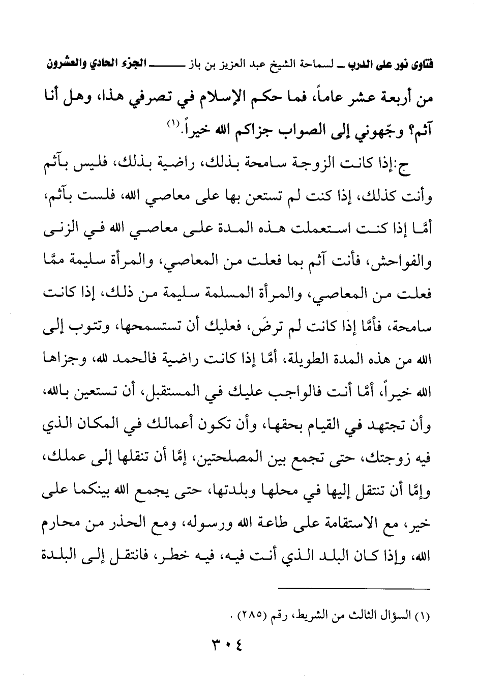ج: إذا كانت الزوجة سامحة بذلك، راضية بذلك، فليس بآثم وأنت كذلك، إذا كنت لم تستعن بها على معاصي الله، فلست بآثم، أما إذا كنت استعملت هذه المدة على معاصي الله في الزنى والفواحش، فأنت آثم بما فعلت من المعاصي، والمرأة سليمة مما فعلت من المعاصي، والمرأة المسلمة سليمة من ذلك، إذا كانت سامحة، فأما إذا كانت لم ترض، فعليك أن تستسمحها، وتتوب إلى الله من هذه المدة الطويلة، أما إذا كانت راضية فالحمد لله، وجزاها الله خيرا، أما أنت فالواجب عليك في المستقبل، أن تستعين بالله، وأن تجتهد في القيام بحقها، وأن تكون أعمالك في المكان الذي فيه زوجتك، حتى تجمع بين المصلحتين، إما أن تنقلها إلى عملك، وإما أن تنتقل إليها في محلها وبلدتها، حتى يجمع الله بينكما على خير، مع الاستقامة على طاعة الله ورسوله، ومع الحذر من محارم الله، وإذا كان البلد الذي أنت فيه، فيه خطر، فانتقل إلى البلدة