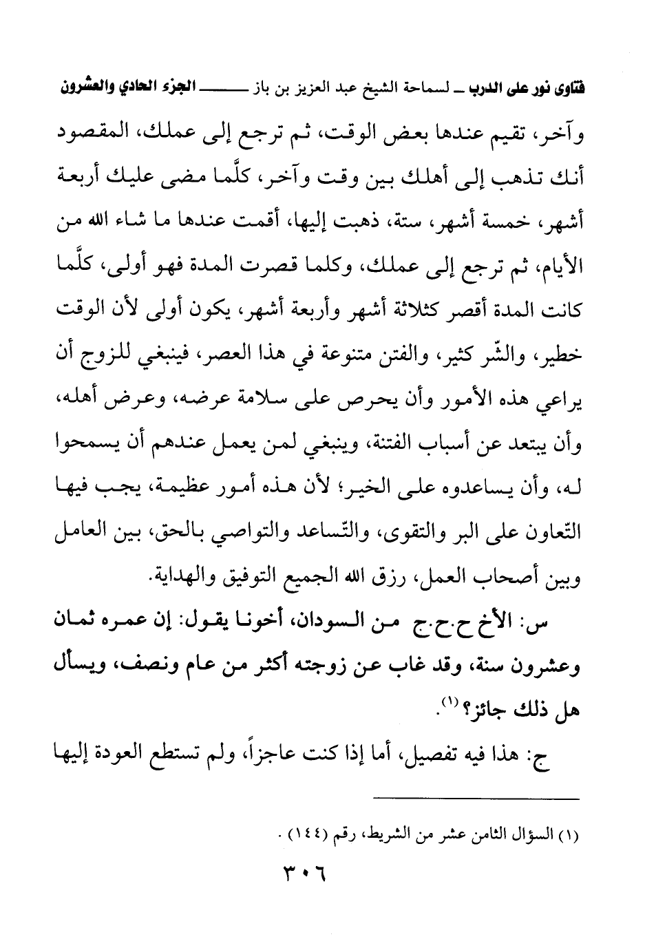 س: الأخ ح. ح. ج من السودان، أخونا يقول: إن عمره ثمان وعشرون سنة، وقد غاب عن زوجته أكثر من عام ونصف، ويسأل هل ذلك جائز؟ (¬1)