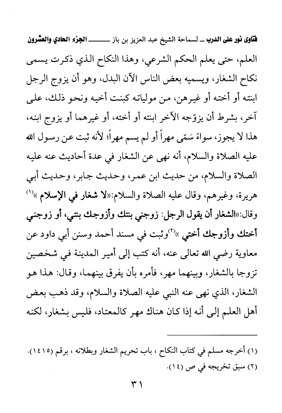 العلم، حتى يعلم الحكم الشرعي، وهذا النكاح الذي ذكرت يسمى نكاح الشغار، ويسميه بعض الناس الآن البدل، وهو أن يزوج الرجل ابنته أو أخته أو غيرهن، من مولياته كبنت أخيه ونحو ذلك، على آخر، بشرط أن يزوجه الآخر ابنته أو أخته، أو غيرهما أو يزوج ابنه، هذا لا يجوز، سواء سمى مهرا أو لم يسم مهرا؛ لأنه ثبت عن رسول الله عليه الصلاة والسلام، أنه نهى عن الشغار في عدة أحاديث عنه عليه الصلاة والسلام، من حديث ابن عمر، وحديث جابر، وحديث أبي هريرة، وغيرهم، وقال عليه الصلاة والسلام: «لا شغار في الإسلام» (¬1) وقال: «الشغار أن يقول الرجل: زوجني بنتك وأزوجك بنتي، أو زوجني أختك وأزوجك أختي» (¬2) وثبت في مسند أحمد وسنن أبي داود عن معاوية رضي الله تعالى عنه، أنه كتب إلى أمير المدينة في شخصين تزوجا بالشغار، وبينهما مهر، فأمره بأن يفرق بينهما، وقال: هذا هو الشغار، الذي نهى عنه النبي عليه الصلاة والسلام، وقد ذهب بعض أهل العلم إلى أنه إذا كان هناك مهر كالمعتاد، فليس بشغار، لكنه