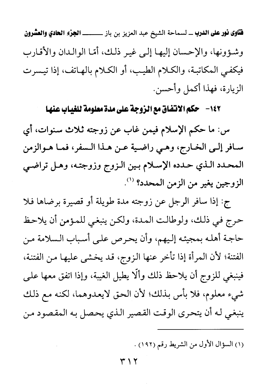 142 - حكم الاتفاق مع الزوجة على مدة معلومة للغياب عنها