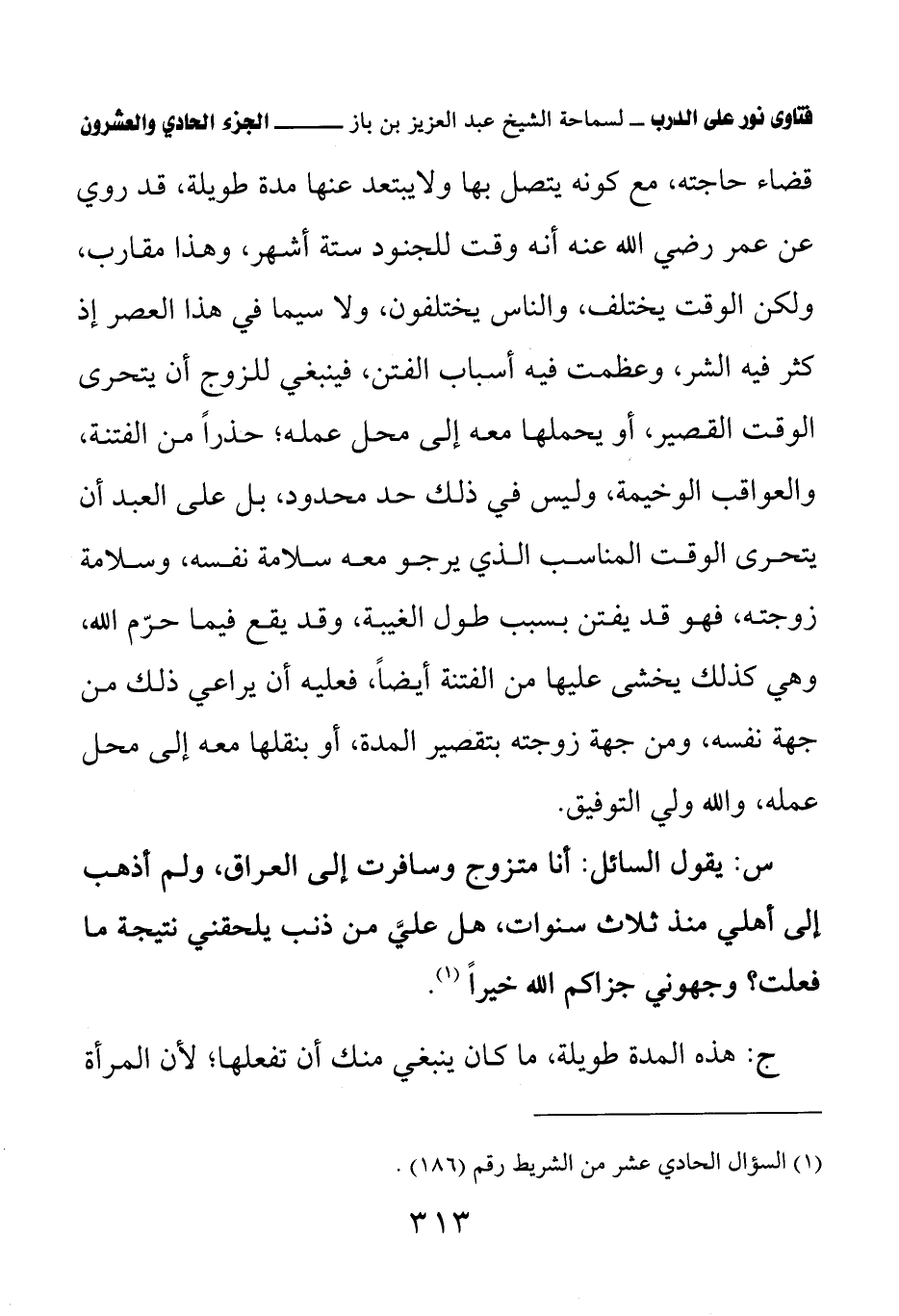 قضاء حاجته، مع كونه يتصل بها ولا يبتعد عنها مدة طويلة، قد روي عن عمر رضي الله عنه أنه وقت للجنود ستة أشهر، وهذا مقارب، ولكن الوقت يختلف، والناس يختلفون، ولا سيما في هذا العصر إذ كثر فيه الشر، وعظمت فيه أسباب الفتن، فينبغي للزوج أن يتحرى الوقت القصير، أو يحملها معه إلى محل عمله؛ حذرا من الفتنة، والعواقب الوخيمة، وليس في ذلك حد محدود، بل على العبد أن يتحرى الوقت المناسب الذي يرجو معه سلامة نفسه، وسلامة زوجته، فهو قد يفتن بسبب طول الغيبة، وقد يقع فيما حرم الله، وهي كذلك يخشى عليها من الفتنة أيضا، فعليه أن يراعي ذلك من جهة نفسه، ومن جهة زوجته بتقصير المدة، أو بنقلها معه إلى محل عمله، والله ولي التوفيق.